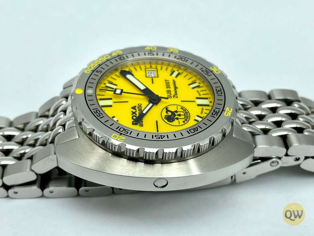 The SUB 300T Divingstar “Poseidon Edition” features a helium escape valve on the left case flank, which allows trapped helium inside the watch to evacuate during decompression in a diving bell. DOXA pioneered the helium escape valve in the late 1960s when it was used extensively by commercial and military divers living for extended periods in underwater habitats and was the first brand to offer it publicly on a watch.