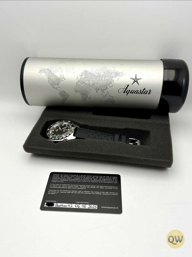 The Aquastar Benthos Heritage II Limited Edition is a modern reinterpretation of the original Benthos, combining historic design cues with contemporary proportions. The watch features a 40 mm 904L stainless steel case paired with a semi-glossy black dial. High-density old radium Super-LumiNova, bold hands, and the distinctive dual-crown layout ensure excellent legibility and a recognisable dive-watch character. Powered by the Sellita SW200-1 automatic movement, it offers a 38-hour power reserve, a frequency of 28,800 vph, and functions including hours, minutes, seconds, a 60-minute unidirectional rotating bezel, and a manual helium escape valve at 4 o’clock. A flat sapphire crystal with triple anti-reflective coating protects the dial, while the ceramic bezel enhances its professional functionality. Water resistance is rated at 300 meters. The watch is fitted on a rubber Wolbrook strap. This Benthos Heritage II Limited Edition is in near mint condition and comes as a full set.