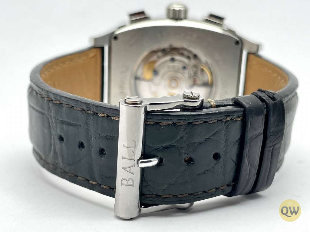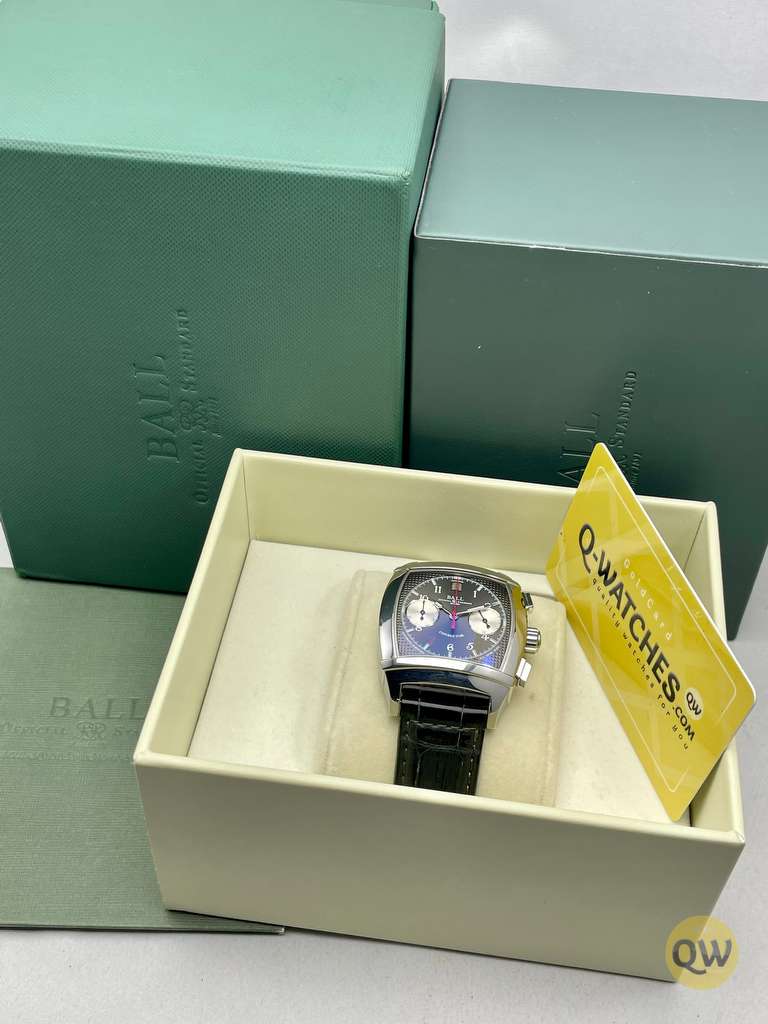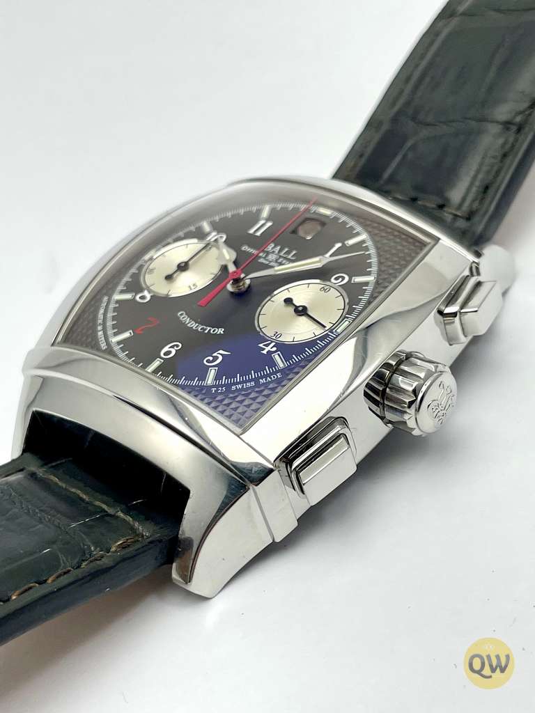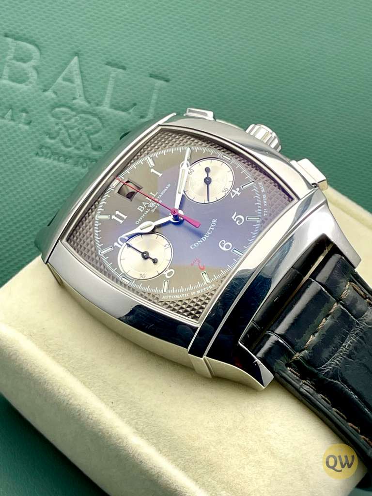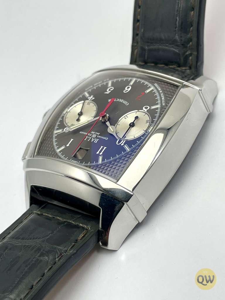 Ball Watch Company Vanderbilt Chronograph. The Ball watches Conductor collection is a vintage watch collection with tonneau shape case and TV screen anti-reflective sapphire crystal, front and back.