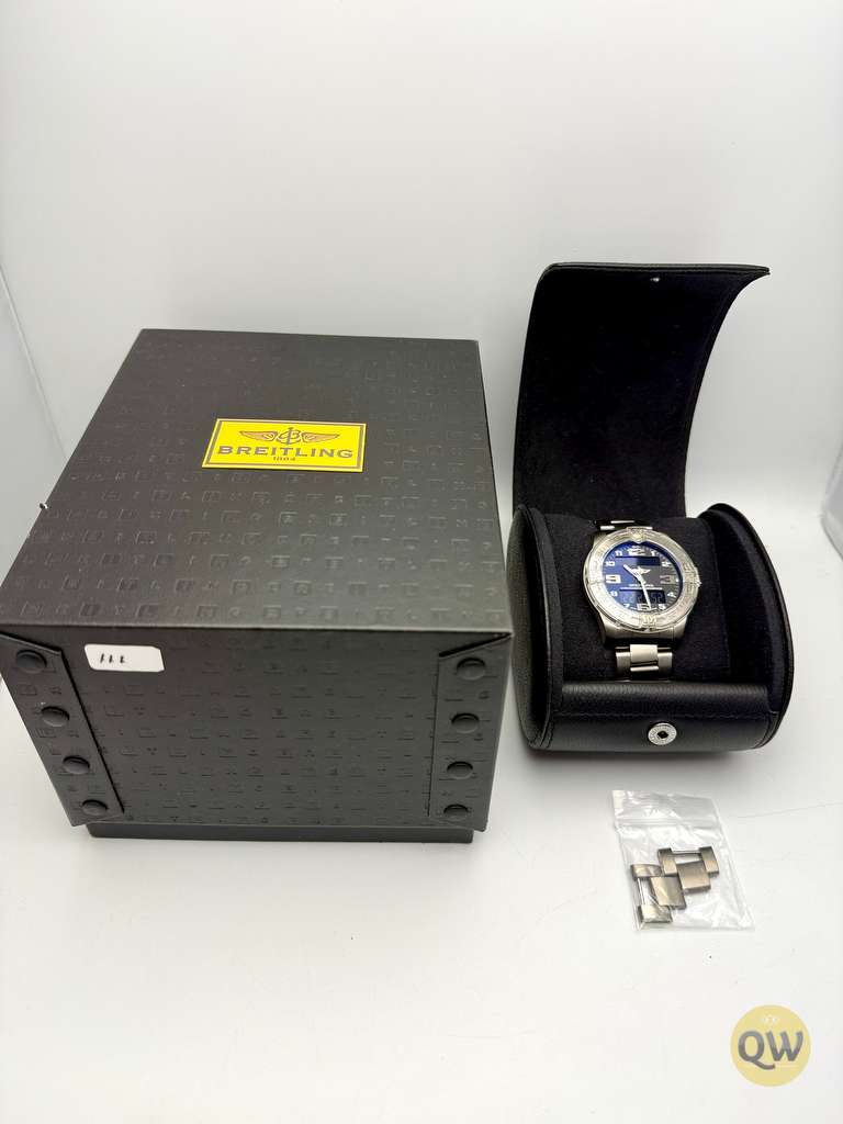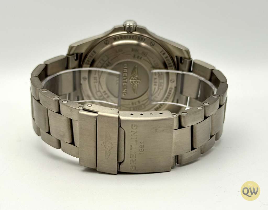 Powered by the Breitling caliber 79 SuperQuartz movement, it offers thermocompensated precision and functions including chronograph, countdown timer, second time zone, alarm, date, and backlight.