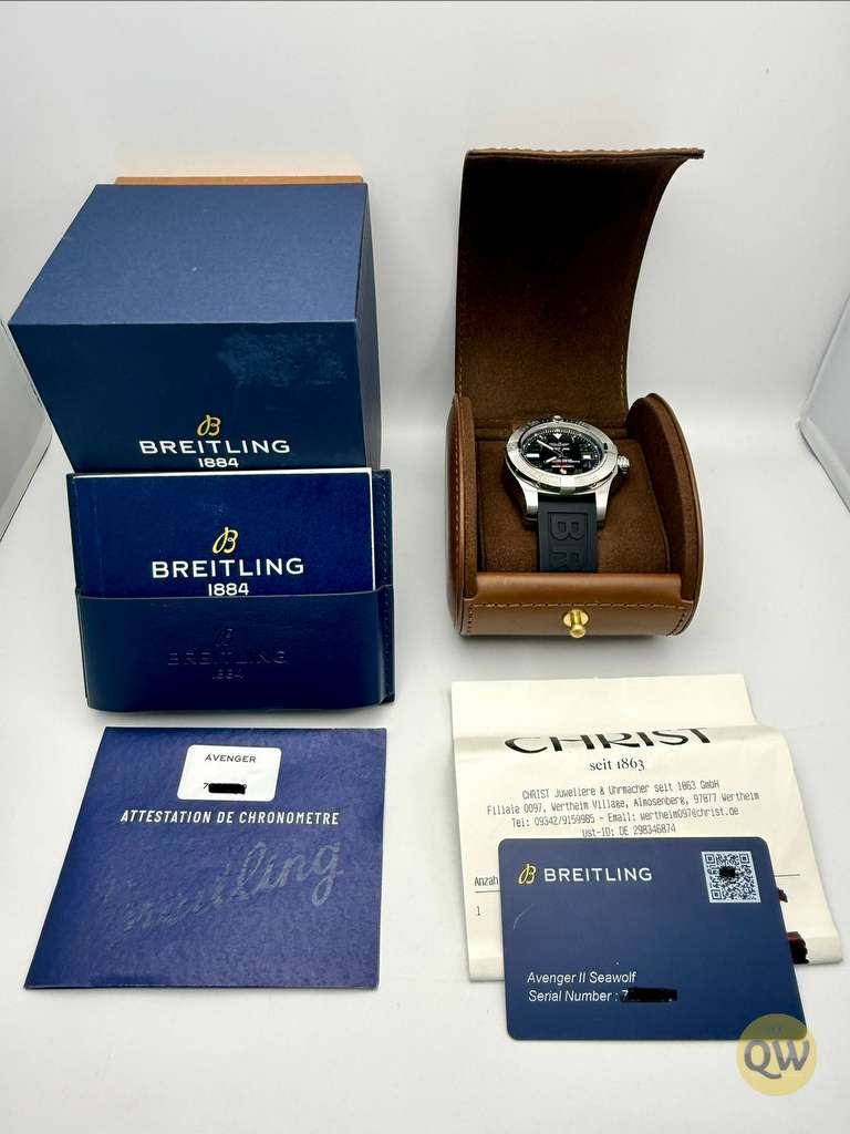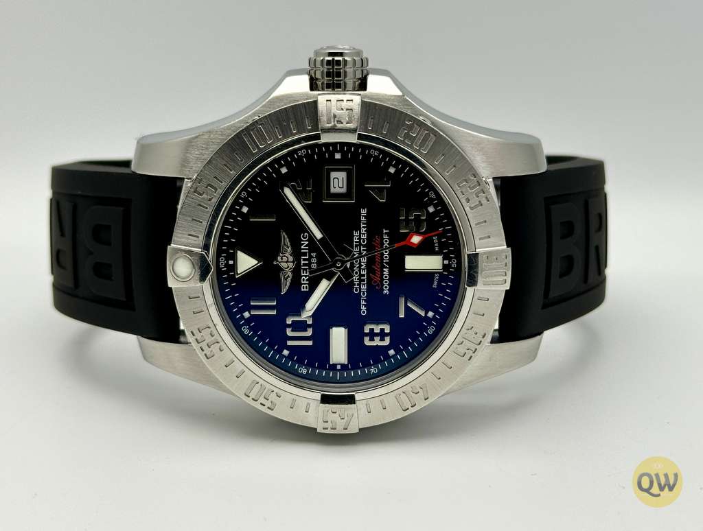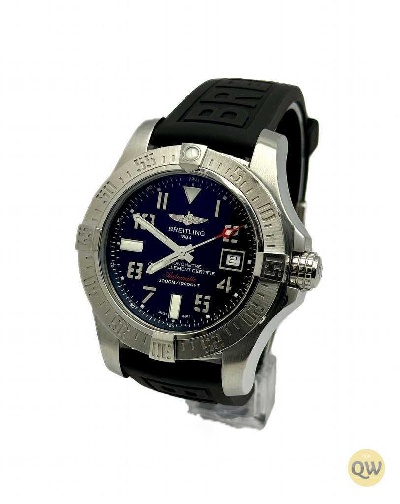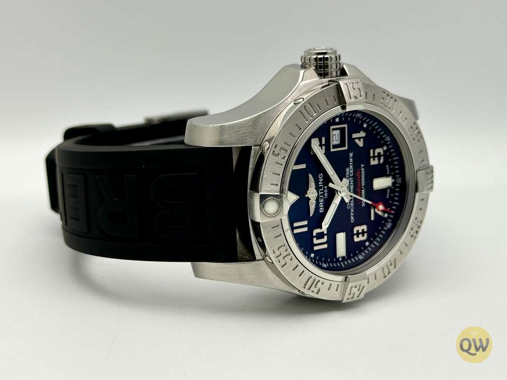 The Breitling Avenger II Seawolf, reference A17331, is a professional dive watch engineered for extreme underwater use. The watch features a 45 mm stainless steel case paired with a black dial. Large luminous hour markers, bold hands, and a clean utilitarian layout ensure excellent legibility. Powered by the Breitling caliber 17 automatic movement, based on the ETA 2824-2, it offers a power reserve of approximately 38 hours, a frequency of 28,800 vph, and functions including hours, minutes, seconds, and date. A sapphire crystal with anti-reflective coating protects the dial, while the unidirectional rotating bezel supports precise dive timing. Water resistance is rated at 3000 meters. The watch is fitted on a black rubber strap with a pin buckle and has the black leather strap also included.