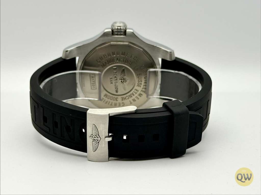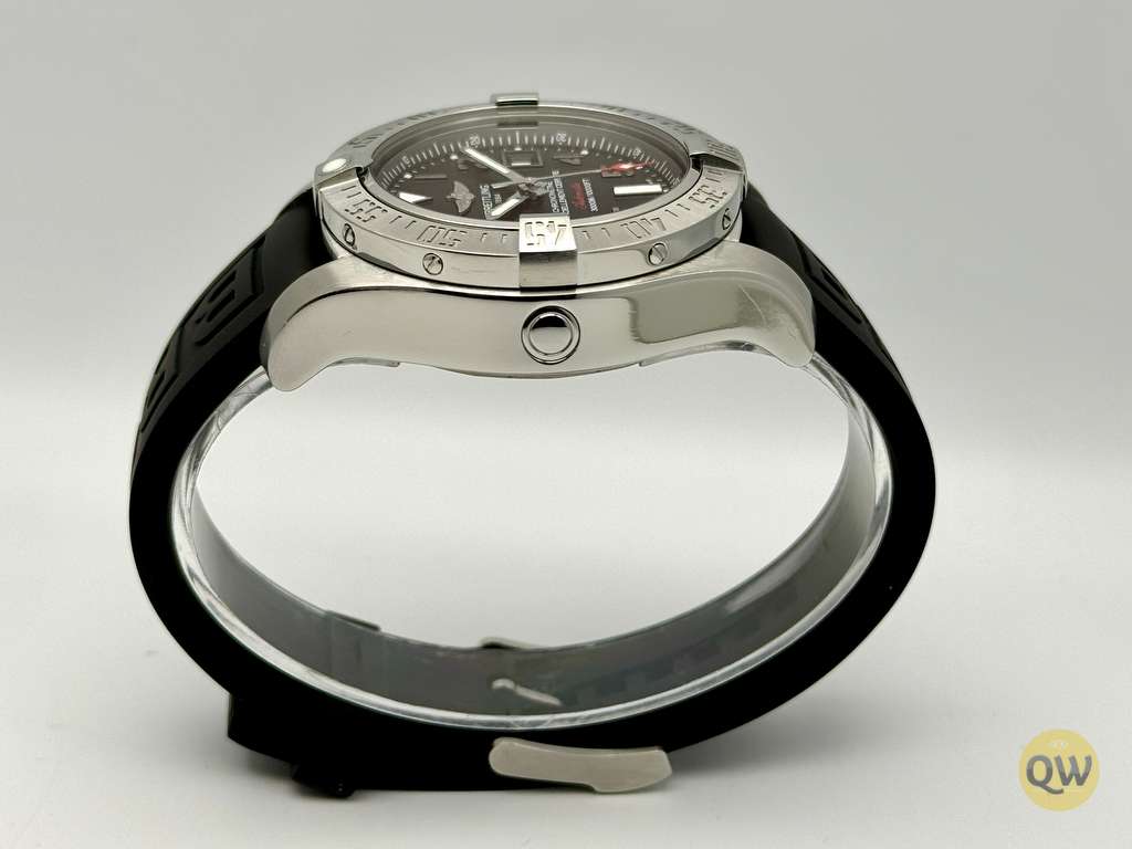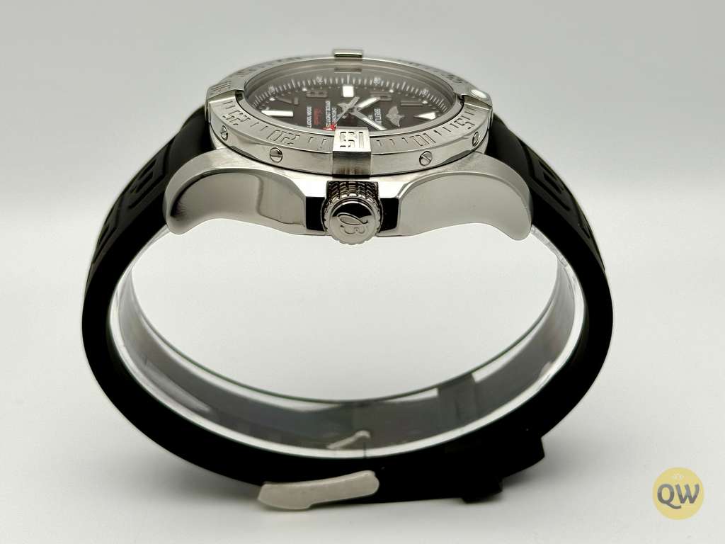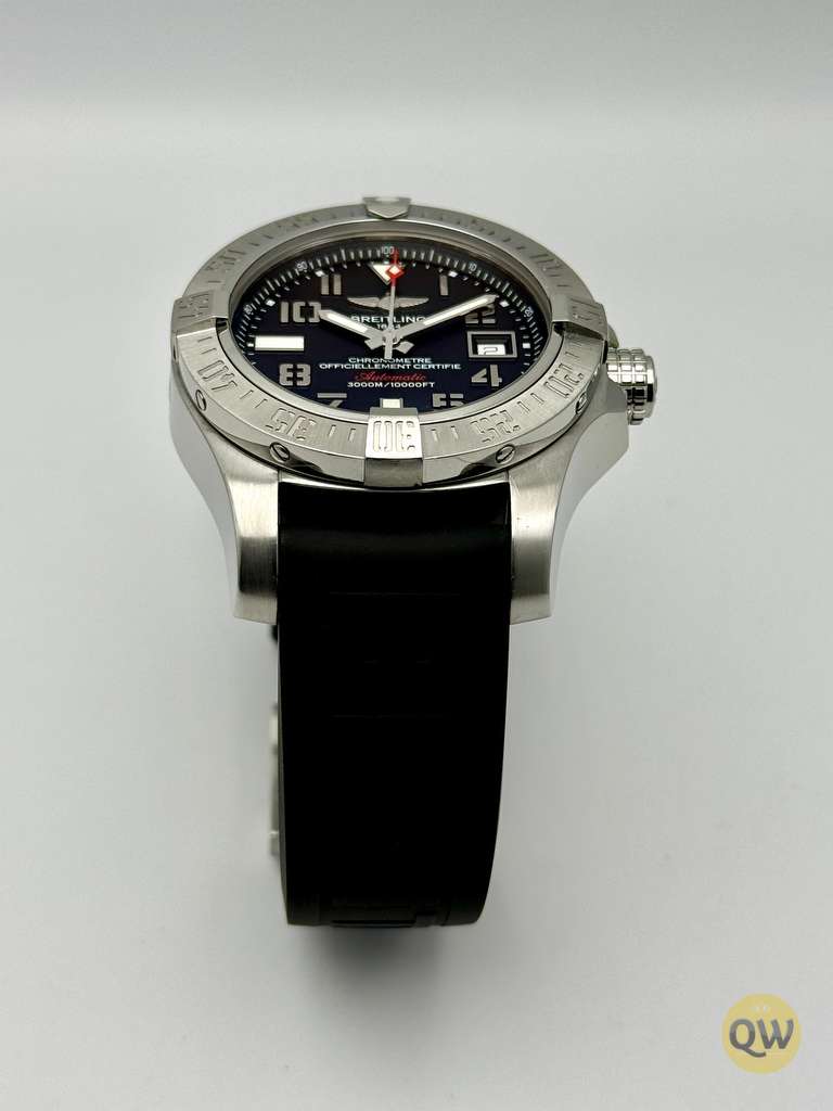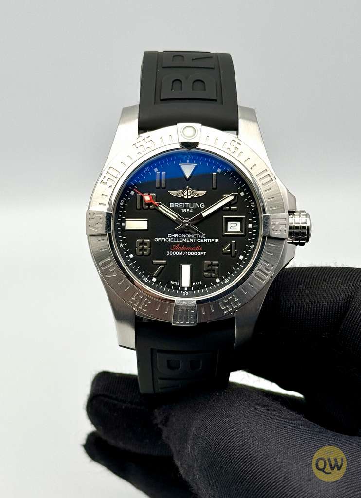 The Breitling Avenger II Seawolf, reference A17331, is a professional dive watch engineered for extreme underwater use. The watch features a 45 mm stainless steel case paired with a black dial. Large luminous hour markers, bold hands, and a clean utilitarian layout ensure excellent legibility. Powered by the Breitling caliber 17 automatic movement, based on the ETA 2824-2, it offers a power reserve of approximately 38 hours, a frequency of 28,800 vph, and functions including hours, minutes, seconds, and date. A sapphire crystal with anti-reflective coating protects the dial, while the unidirectional rotating bezel supports precise dive timing. Water resistance is rated at 3000 meters. The watch is fitted on a black rubber strap with a pin buckle and has the black leather strap also included.