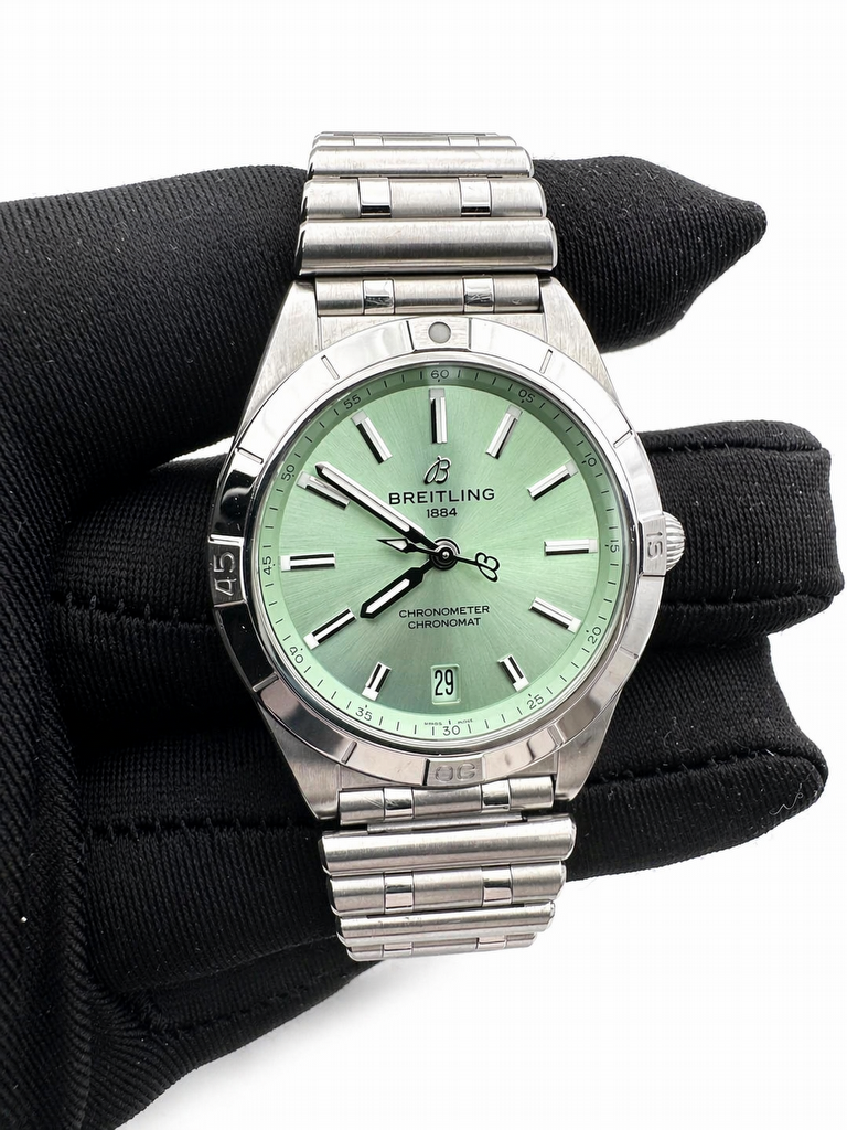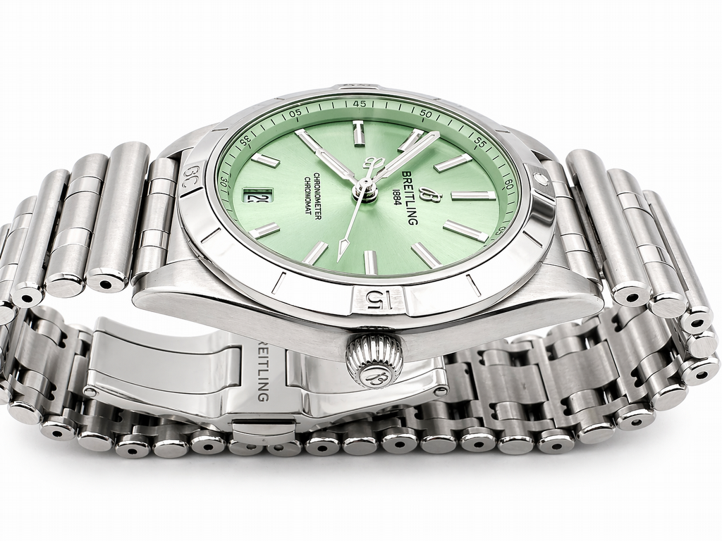 The Breitling Chronomat 36, reference A10380101L1A1, is a compact and elegant sport watch designed for everyday versatility. The watch features a 36 mm stainless steel case paired with a green dial. Applied hour markers, luminous hands, and the signature rider-tab bezel design ensure excellent legibility and a distinctive appearance. Powered by the Breitling B10 automatic movement, based on the ETA 2892-A2, it offers a power reserve of approximately 42 hours, a frequency of 28,800 vph, and functions including hours, minutes, seconds, and date. A sapphire crystal with anti-reflective coating protects the dial, while the unidirectional rotating bezel enhances its sporty character. Water resistance is rated at 100 meters. The watch is fitted on a stainless steel rouleaux bracelet with a folding clasp.