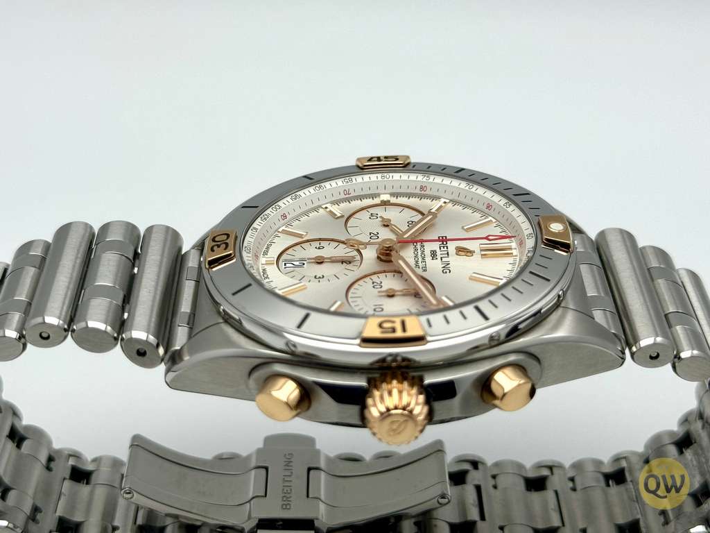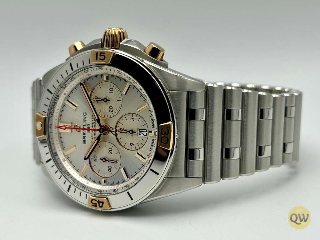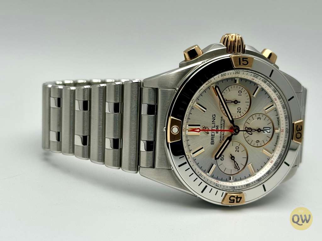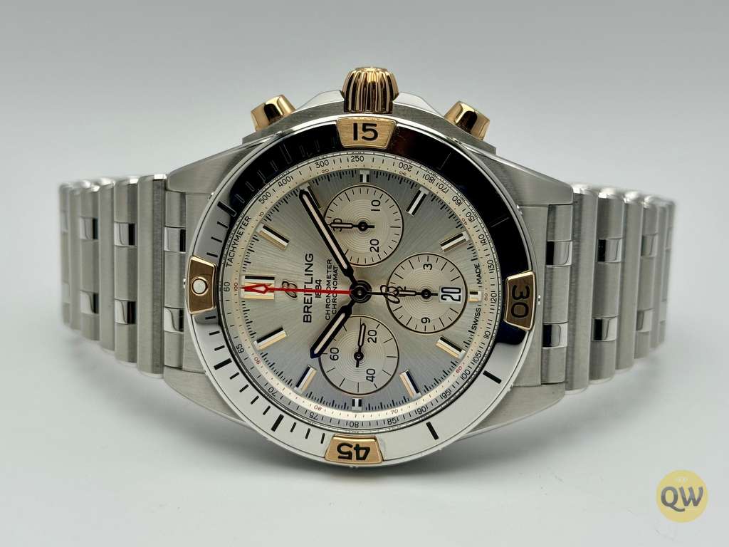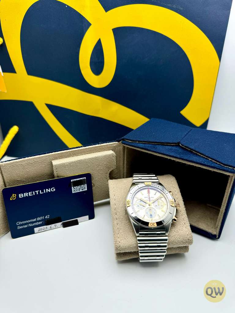 This Chronomat features a 42 mm case and the iconic bezel with the four rider tabs in 18k gold and the “Rouleaux” steel bracelet and is powered by the in-house Breitling Manufacture Caliber 01. The watch is from 6-2023 and is in neat mint condition. Factory warranty until 6-2028.