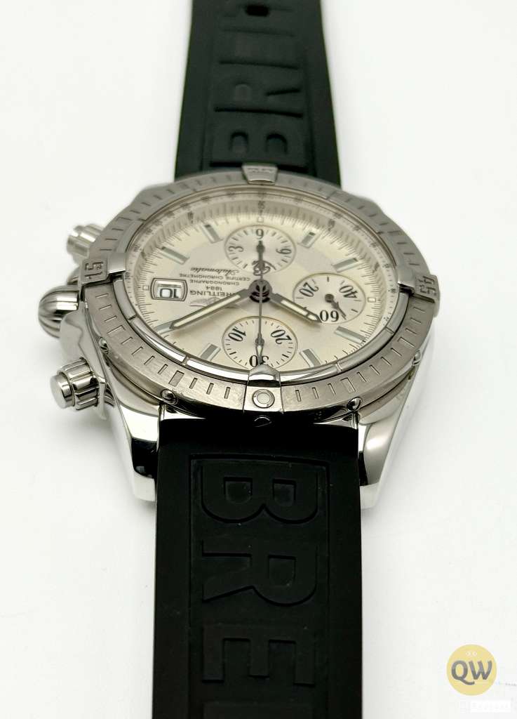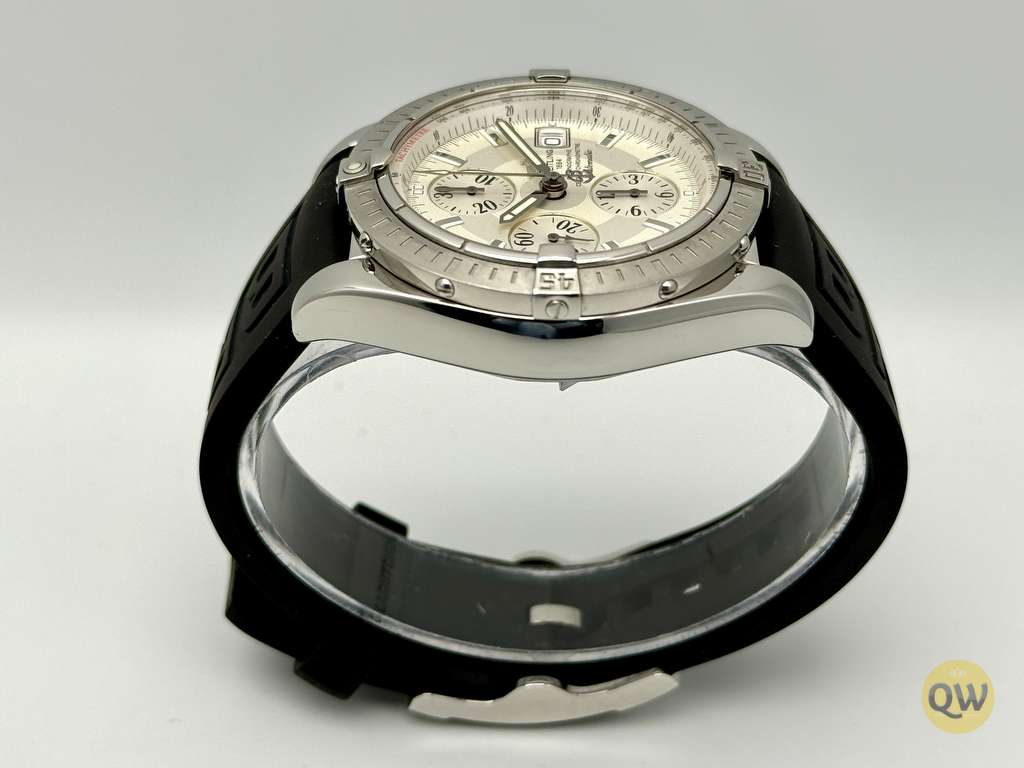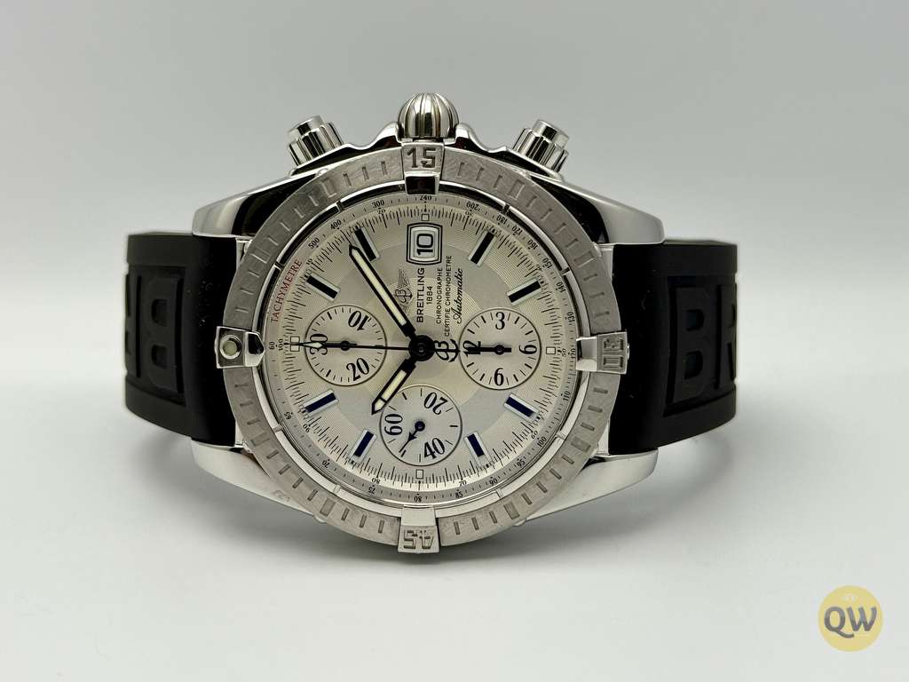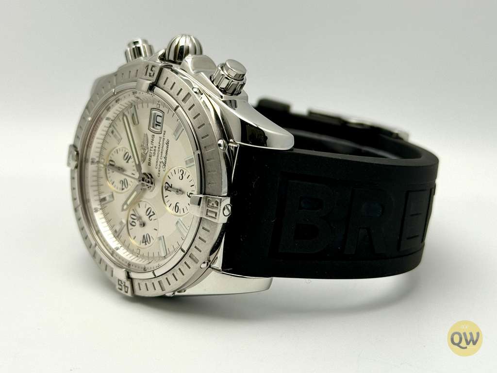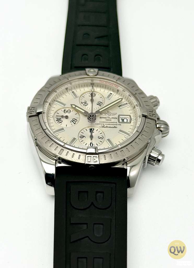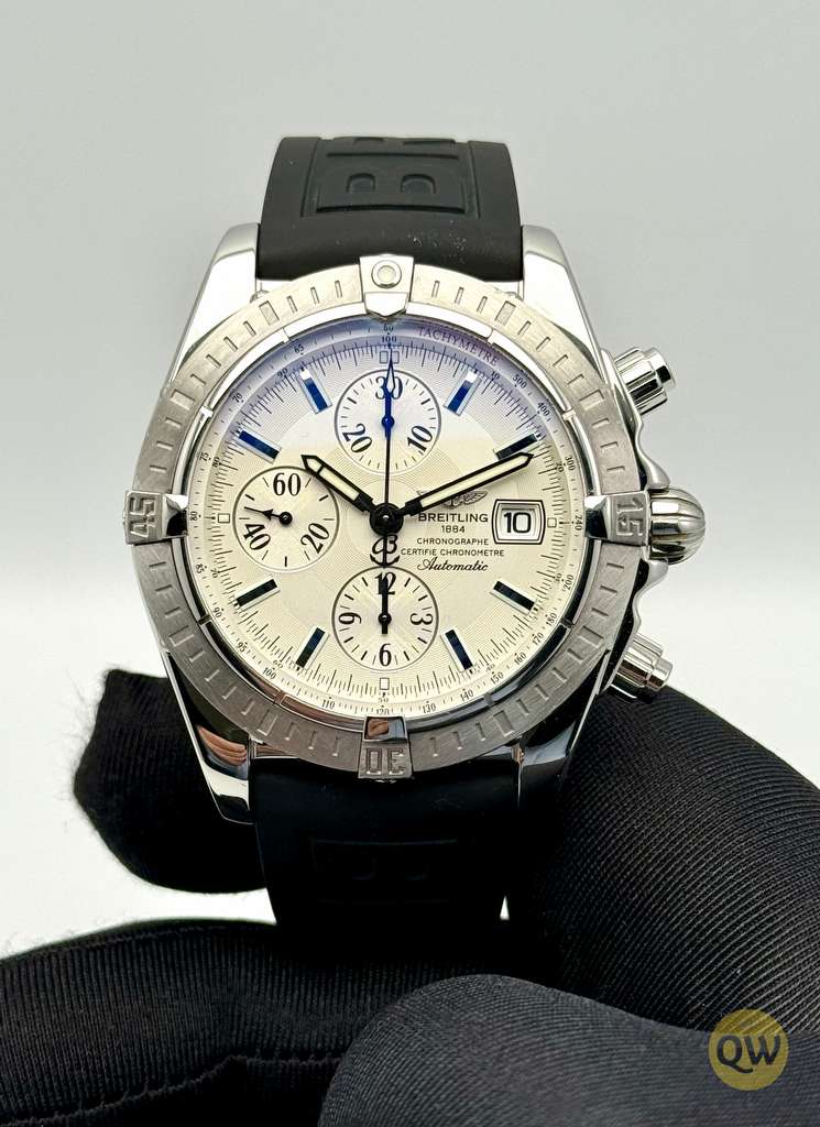 The Breitling Chronomat, reference A13356, features a 44 mm stainless steel case with a silver-white dial and subdials, and luminous hands and markers for excellent legibility. Powered by the Breitling caliber 13 automatic chronograph movement, this COSC-certified movement ensures reliable, chronometer-level accuracy.