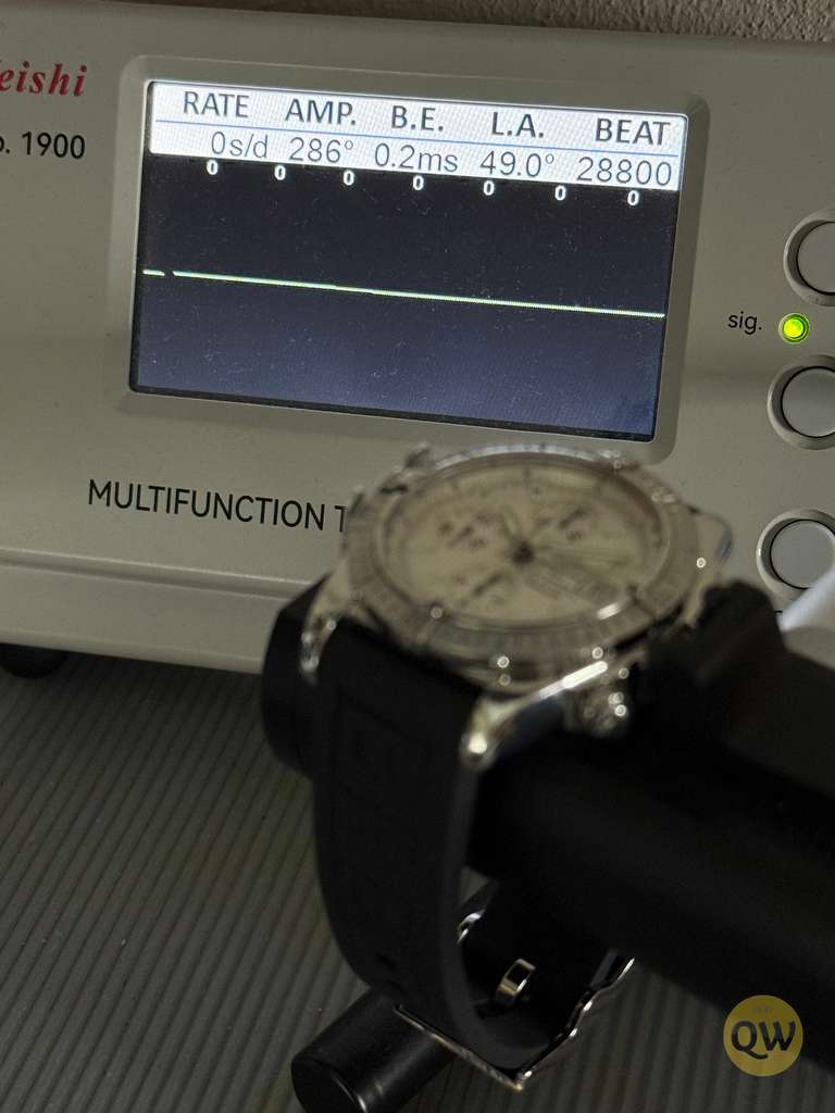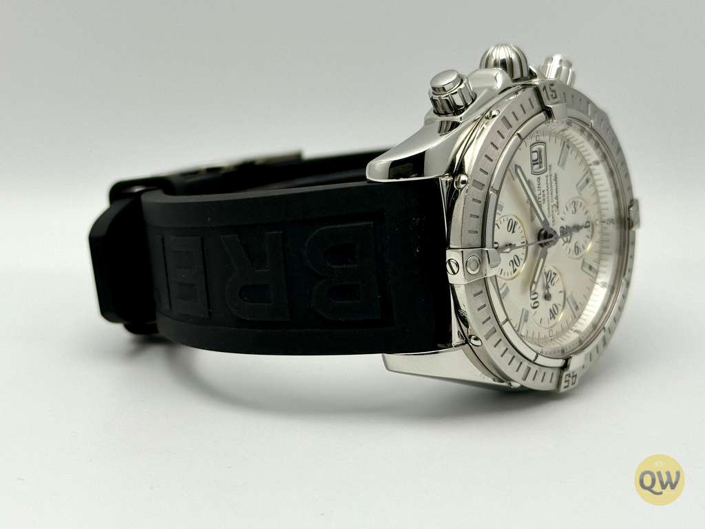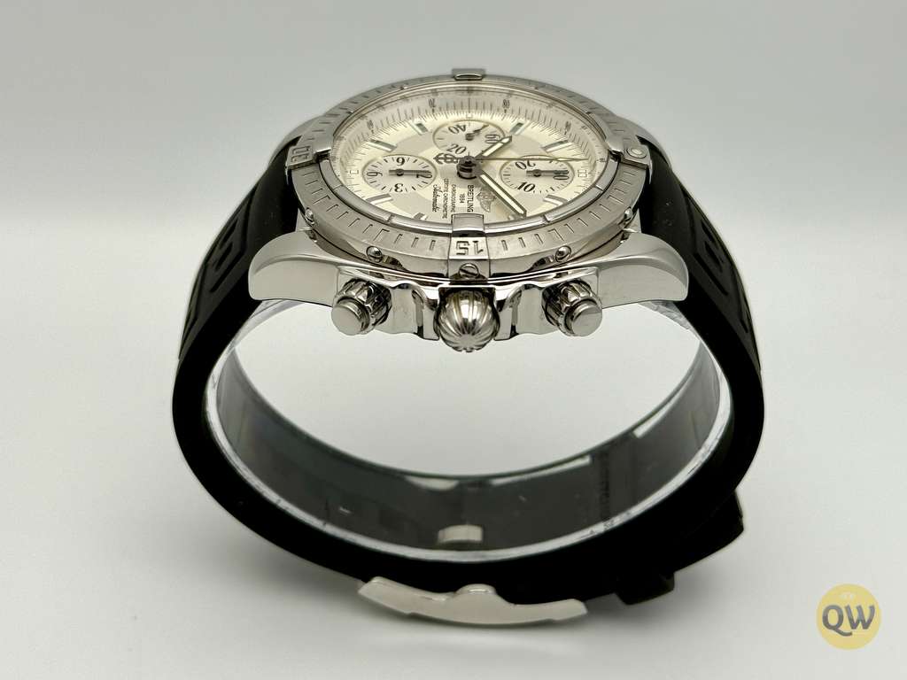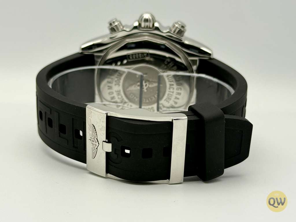 A scratch-resistant sapphire crystal with anti-reflective coating ensures clarity, while the unidirectional rotating bezel adds functional utility and reinforces the watch’s sporty character. With 300 meters of water resistance and a screw-down crown, the Chronomat is engineered for both durability and versatility. This model is fitted on a black Breitling rubber strap with a stainless steel pin buckle, giving the watch a modern and sporty appearance.