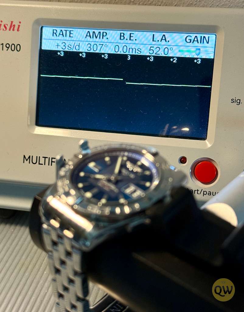 A sapphire crystal with anti-reflective coating protects the dial, while the unidirectional rotating bezel enhances its sporty functionality. Water resistance is rated at 300 meters. The watch is fitted on a stainless steel bracelet with a folding clasp, and includes no additional strap.