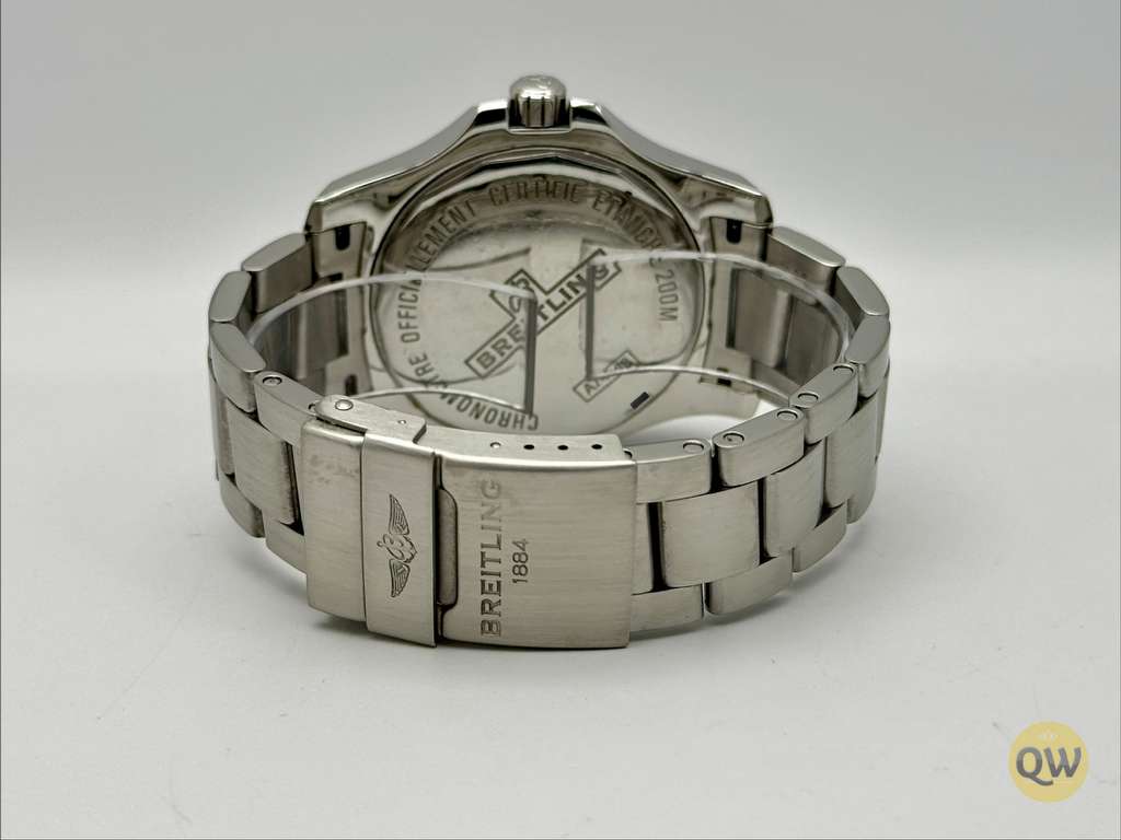Powered by the Breitling caliber 74 SuperQuartz movement, it offers thermocompensated precision and functions including hours, minutes, seconds, and date. A sapphire crystal with anti-reflective coating protects the dial, while the unidirectional rotating bezel enhances its sporty functionality. Water resistance is rated at 200 meters. The watch is fitted on a stainless steel bracelet with a folding clasp.