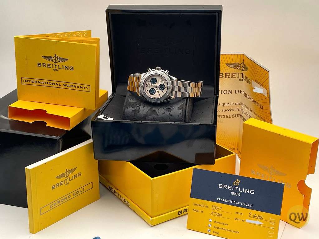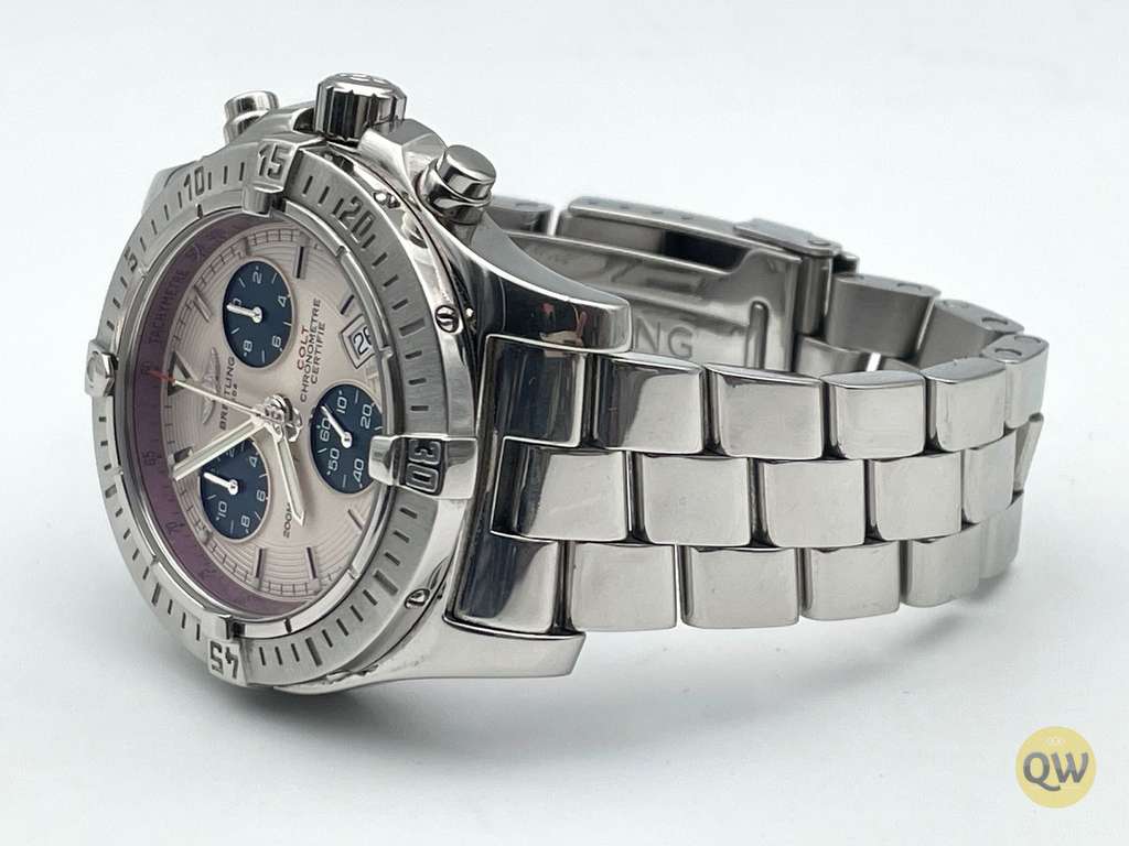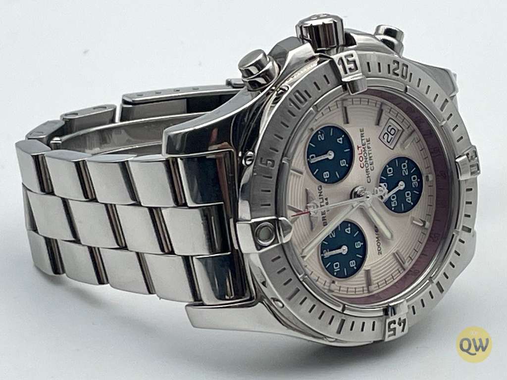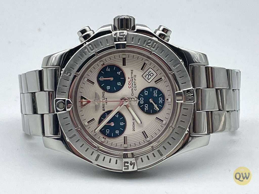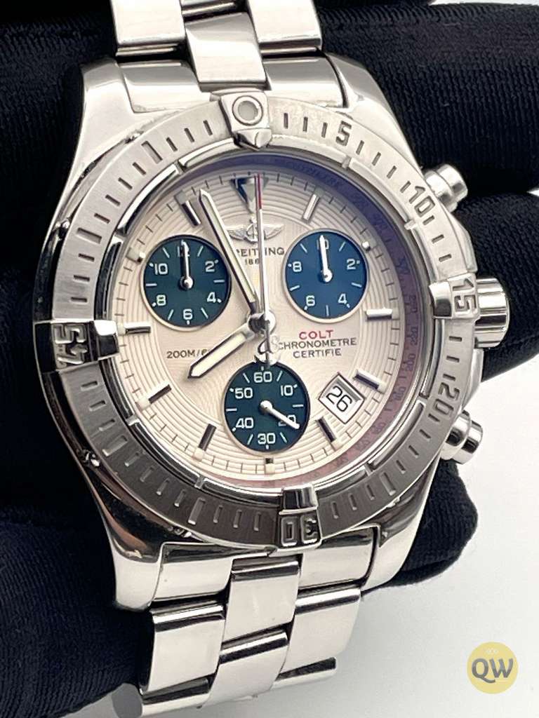 Perfectly embodying the youthful, dynamic, and winning style of the Colt collection, this Colt Chronograph with a 41mm size case is an old skool Breitling and yet very comfortable to wear,  solid build, and features the right Breitling characteristics such as the applied logo and a beautifully finished dial. The Panda-color dial configuration is the most wanted version of this series and quite rare, so hard to find!