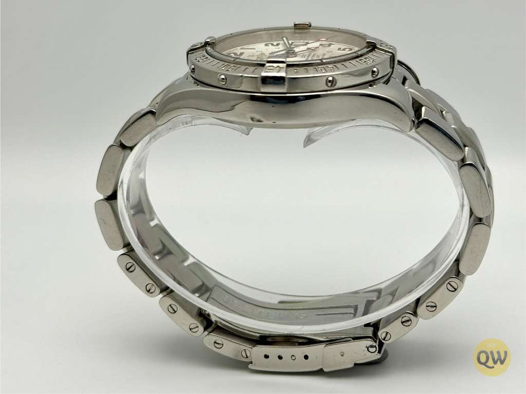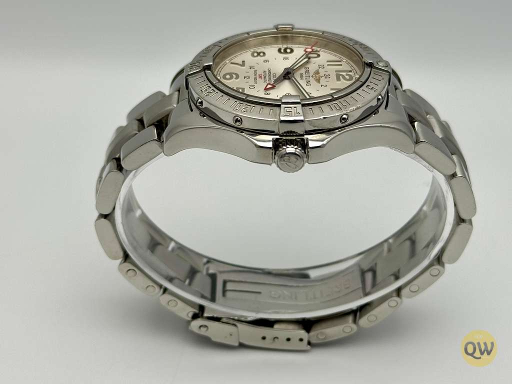 The Breitling Colt GMT Automatic, reference A32350, features a 40 mm stainless steel case paired with a silver dial, accented by bold luminous hands and hour markers for excellent readability. Powered by the Breitling caliber 32 automatic movement (based on the ETA 2893-2), it offers a 42-hour power reserve, a frequency of 28,800 vph, and GMT functionality via an additional 24-hour hand, allowing a second time zone to be tracked simultaneously. A date display is positioned at 3 o’clock.