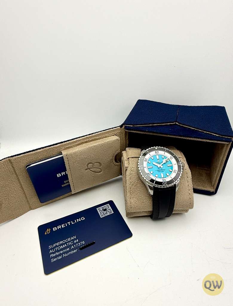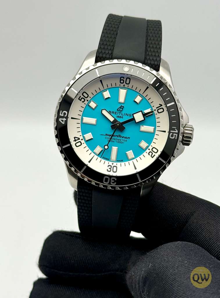 The Breitling SuperOcean, reference A17376211L2S1, features a 44 mm stainless steel case with a vibrant turquoise dial, bold luminous hands, and oversized hour markers for exceptional underwater legibility. Powered by the Breitling caliber 17 automatic movement (based on the ETA 2824-2, with a 38-hour power reserve and a frequency of 28,800 vph), it offers hours, minutes, central seconds, and a date display at 6 o’clock, all with COSC-certified chronometer precision.