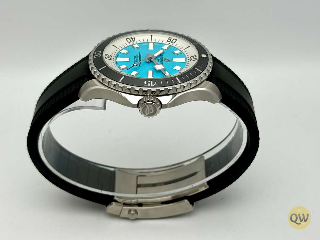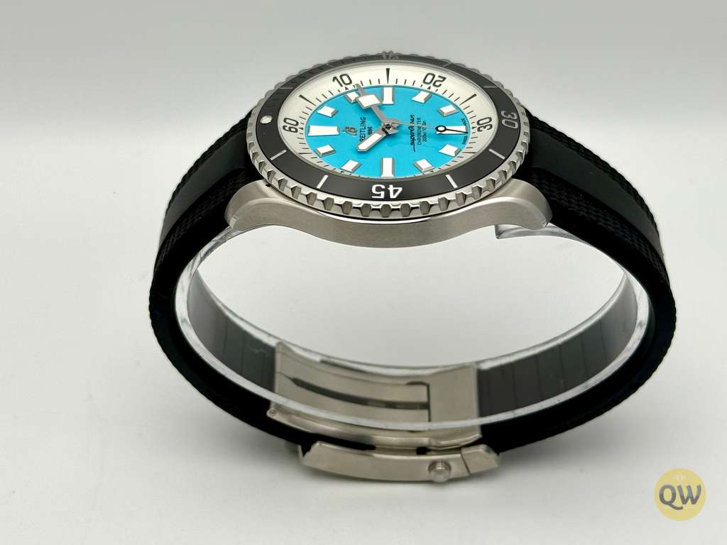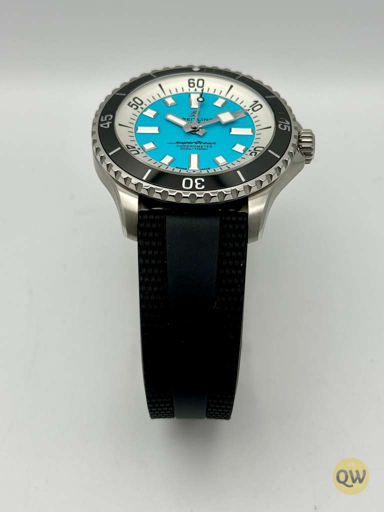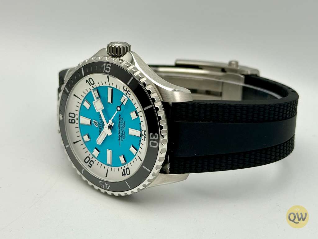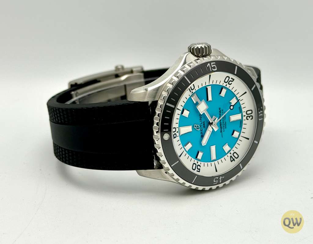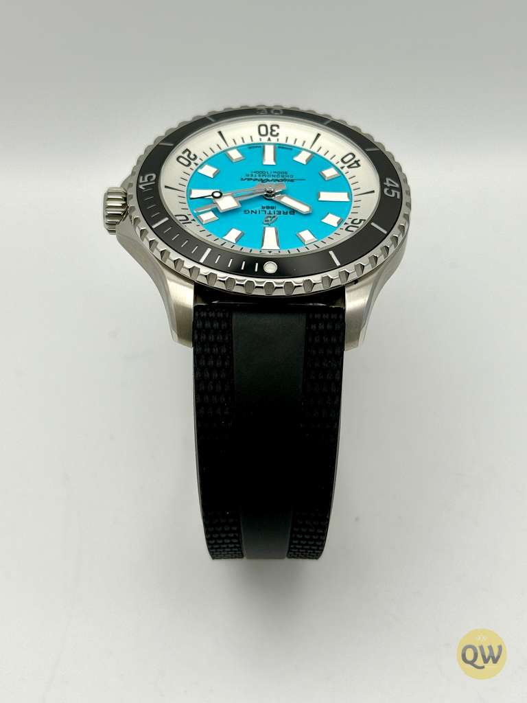A scratch-resistant sapphire crystal with anti-reflective coating ensures clarity, while the unidirectional rotating bezel with ceramic inlay enhances durability and adds a refined, sporty look. With 300 meters of water resistance, a screw-down crown, and Breitling’s solid dive construction, the watch is engineered for both aquatic performance and daily wear. This model is fitted on a turquoise rubber strap with a stainless steel folding clasp, complementing the dial’s vivid color.