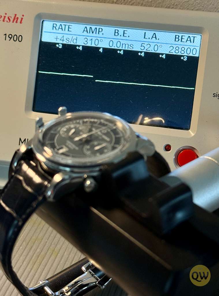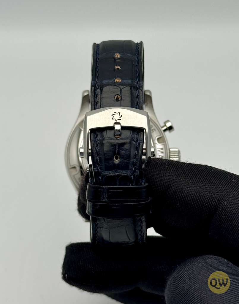A double-domed sapphire crystal with anti-reflective coating on both sides ensures excellent clarity, while the sapphire crystal case back reveals the movement. Water resistance is rated to 3 bar (30 meters). The watch is fitted on a Louisiana alligator leather strap with a stainless steel pin lock folding clasp, combining comfort with a refined dress-chronograph character.