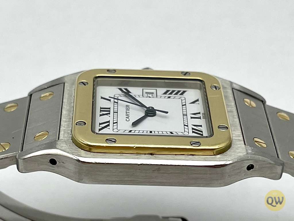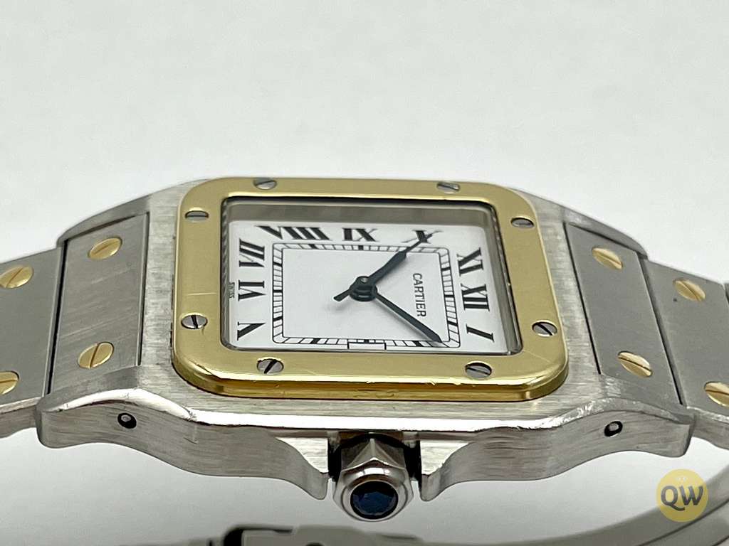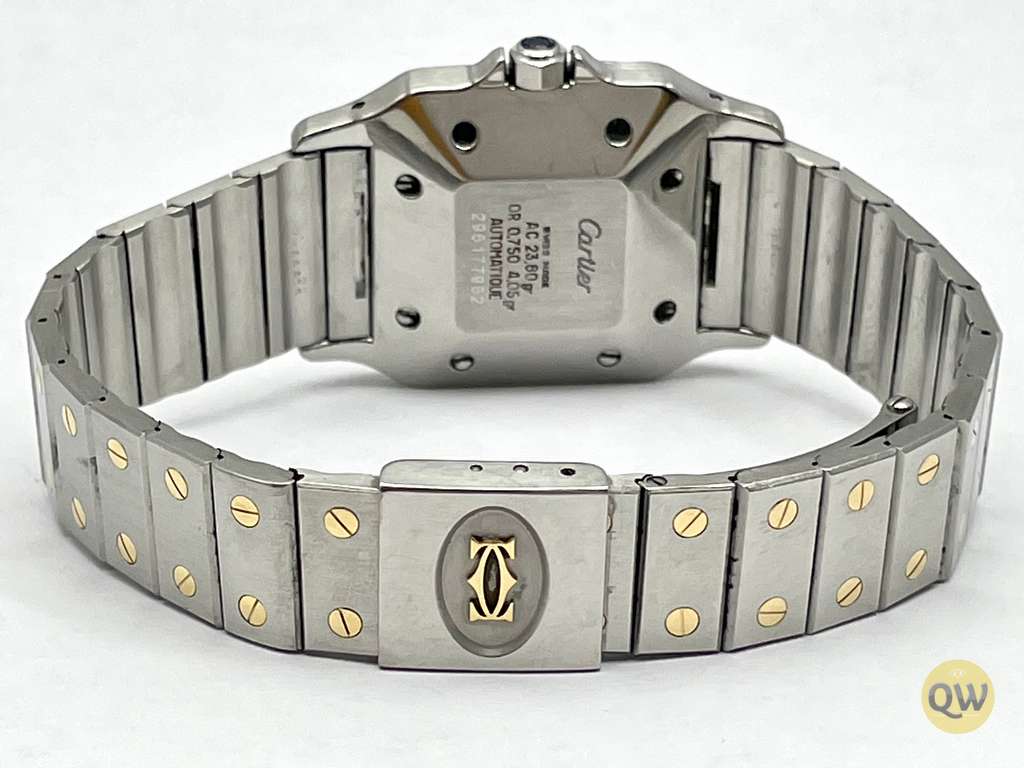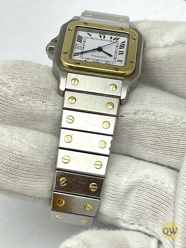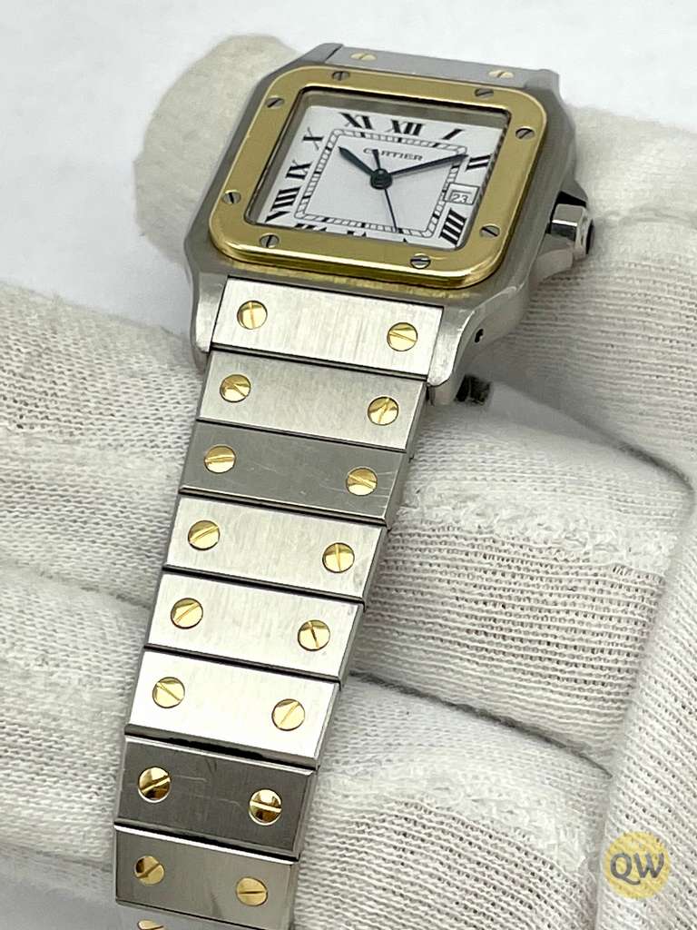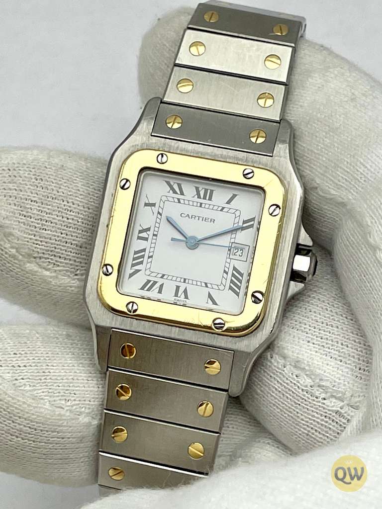 Cartier has long been recognized as one of the leading designers of watches for gentlemen and ladies. The Santos model was created in 1904 at the request of its namesake, Alberto Santos-Dumont, who was an aviator and wanted a watch he could wear on his wrist while flying instead of a pocket watch. This particular model is in stainless steel with 18k yellow gold accents on the bracelet and case. The dial features the Cartier secret signature at 7 o'clock.