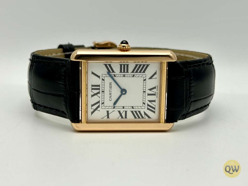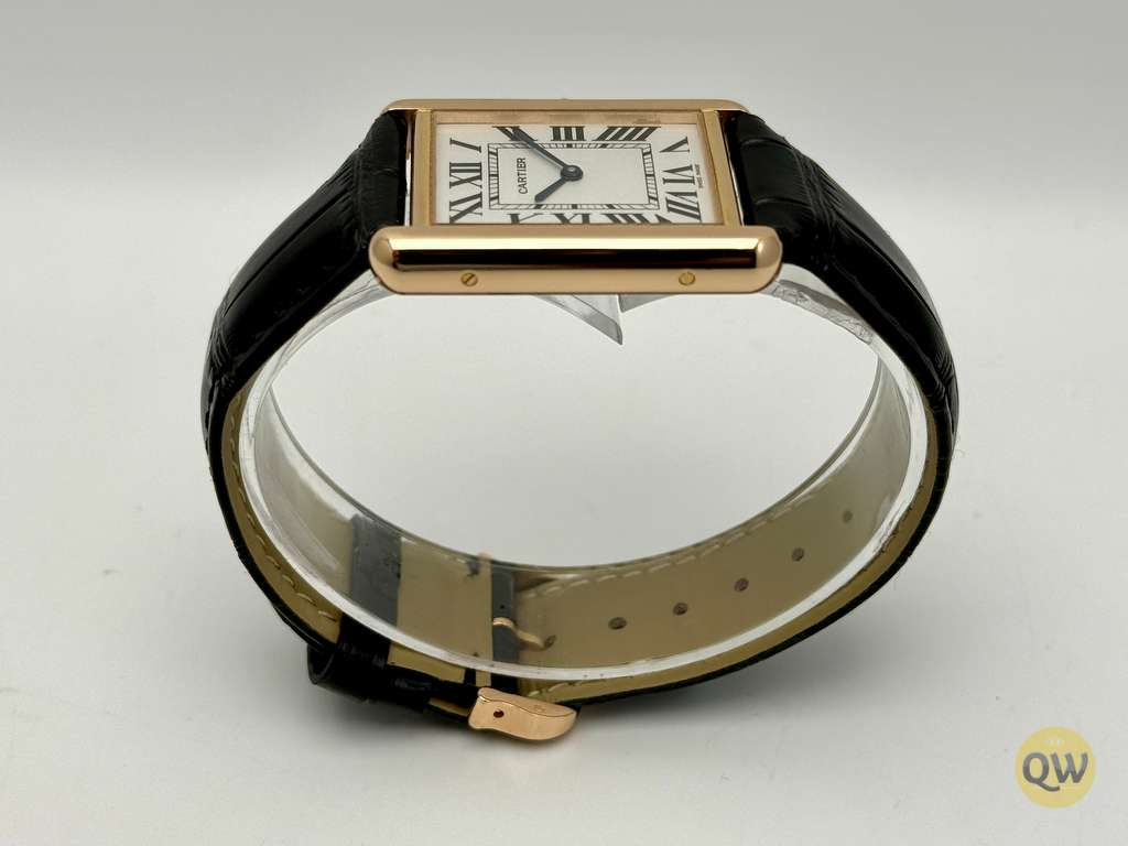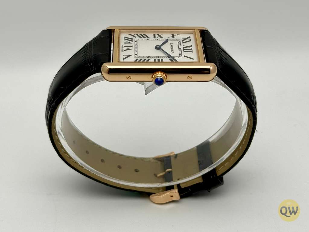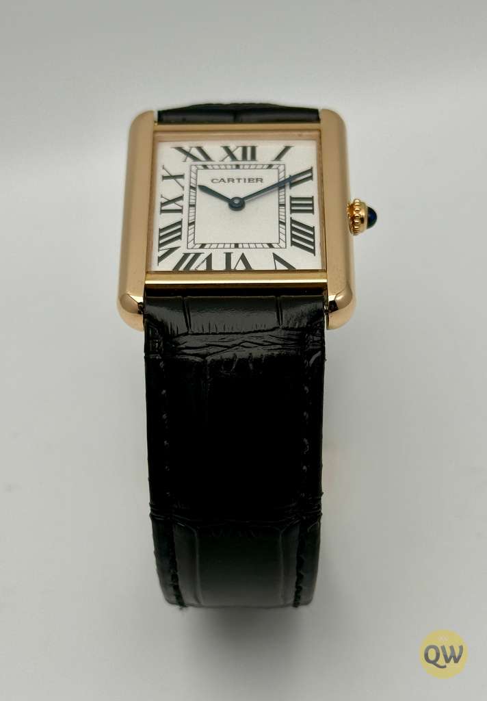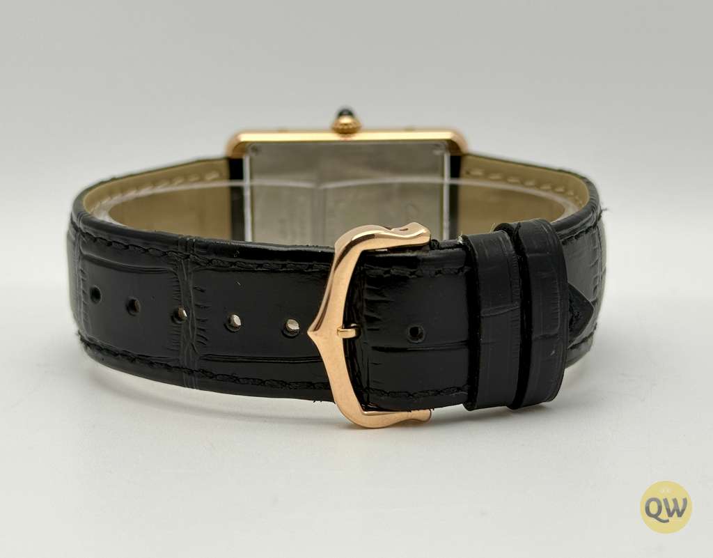 The Cartier Tank Solo, reference W5200025, is a refined dress watch that embodies classic Cartier design in a large case size. The watch features a 34 mm x 27 mm 18k rose gold case paired with a silvered dial. Black Roman numerals, blued steel hands, and the signature chemin de fer minute track create a timeless and elegant appearance. Powered by a Cartier quartz movement, it offers reliable precision with functions including hours and minutes. A sapphire crystal protects the dial, while the smooth polished bezel enhances its classic profile. Water resistance is rated at 30 meters. The watch is fitted on a fresh leather strap with a pin buckle.