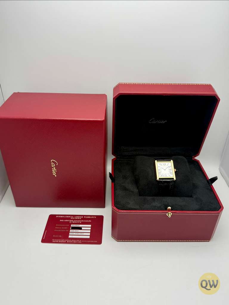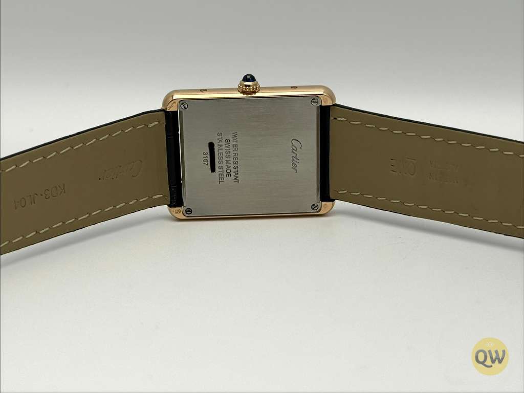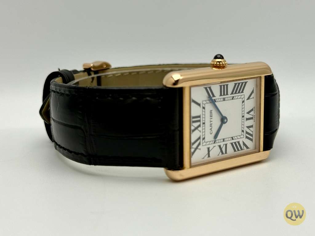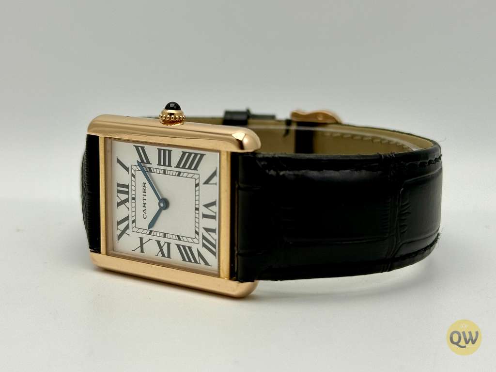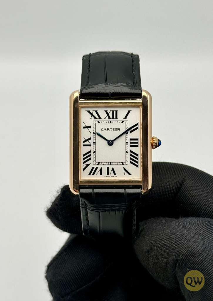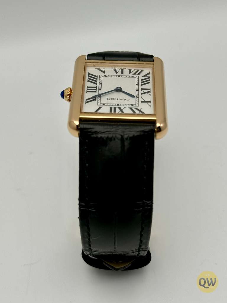The Cartier Tank Solo, reference W5200025, is a refined dress watch that embodies classic Cartier design in a large case size. The watch features a 34 mm x 27 mm 18k rose gold case paired with a silvered dial. Black Roman numerals, blued steel hands, and the signature chemin de fer minute track create a timeless and elegant appearance. Powered by a Cartier quartz movement, it offers reliable precision with functions including hours and minutes. A sapphire crystal protects the dial, while the smooth polished bezel enhances its classic profile. Water resistance is rated at 30 meters. The watch is fitted on a fresh leather strap with a pin buckle.