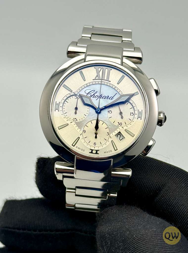 The Chopard Imperiale Chronograph, reference 388549-3002, features a 40 mm stainless steel case paired with a mother of pearl dial adorned with elegant Roman numerals and well-balanced chronograph subdials. Powered by an Chopard 1185 automatic chronograph movement based on a Swiss ETA architecture, it delivers reliable performance with chronograph functionality, small seconds, and a date display, making it both practical and elegant for everyday wear.