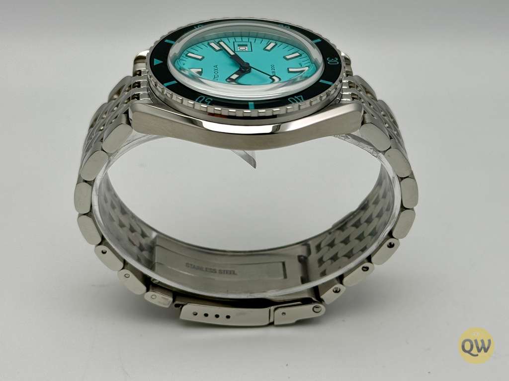 The Doxa Sub 200 Aqua, reference 799.10.241.25, is a compact diver’s watch designed for everyday wear and underwater reliability. The watch features a 42 mm stainless steel case paired with an aqua blue dial. Applied hour markers, luminous hands, and a clean high-contrast layout ensure excellent legibility. Powered by the automatic Sellita SW200-1 movement, it offers a power reserve of approximately 38 hours, a frequency of 28,800 vph, and functions including hours, minutes, seconds, and date. A sapphire crystal with anti-reflective coating protects the dial, while the unidirectional rotating bezel supports precise dive timing. Water resistance is rated at 200 meters. The watch is fitted on a stainless steel bracelet with a folding clasp.
