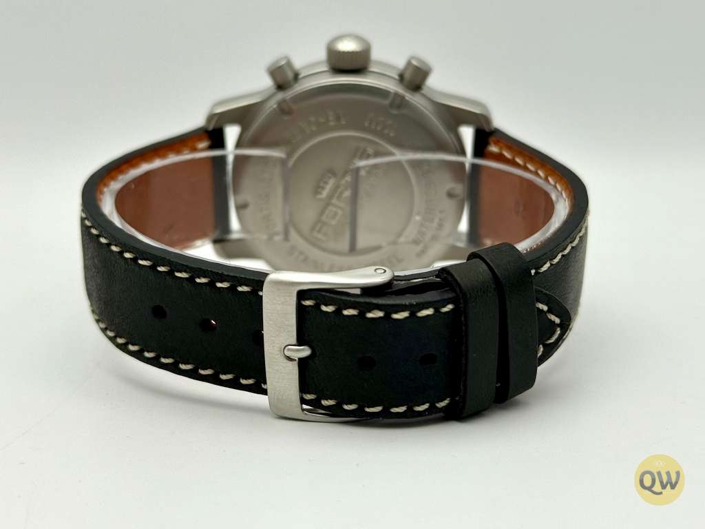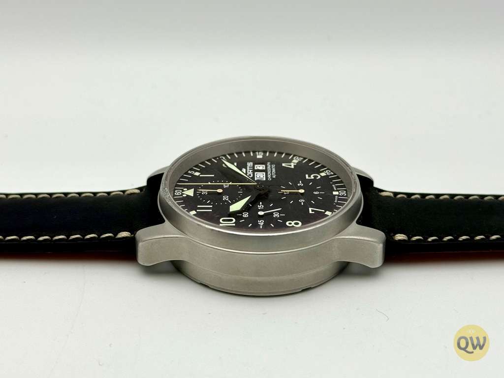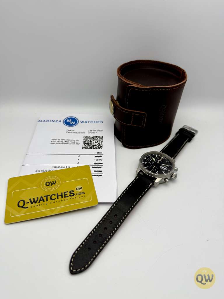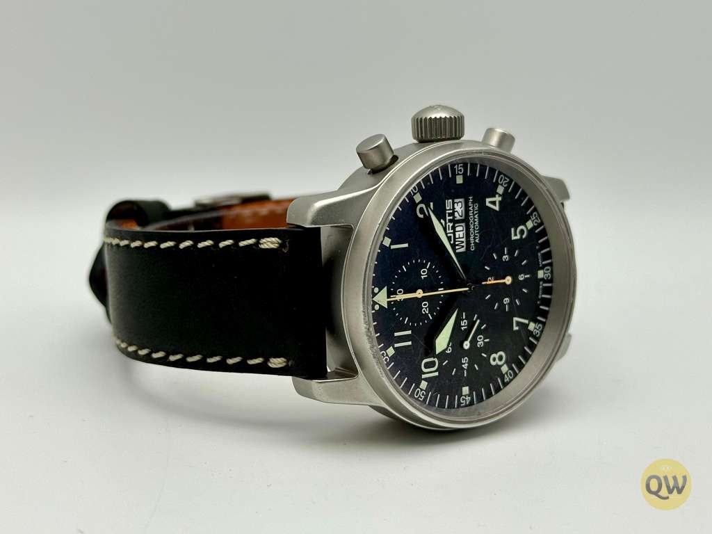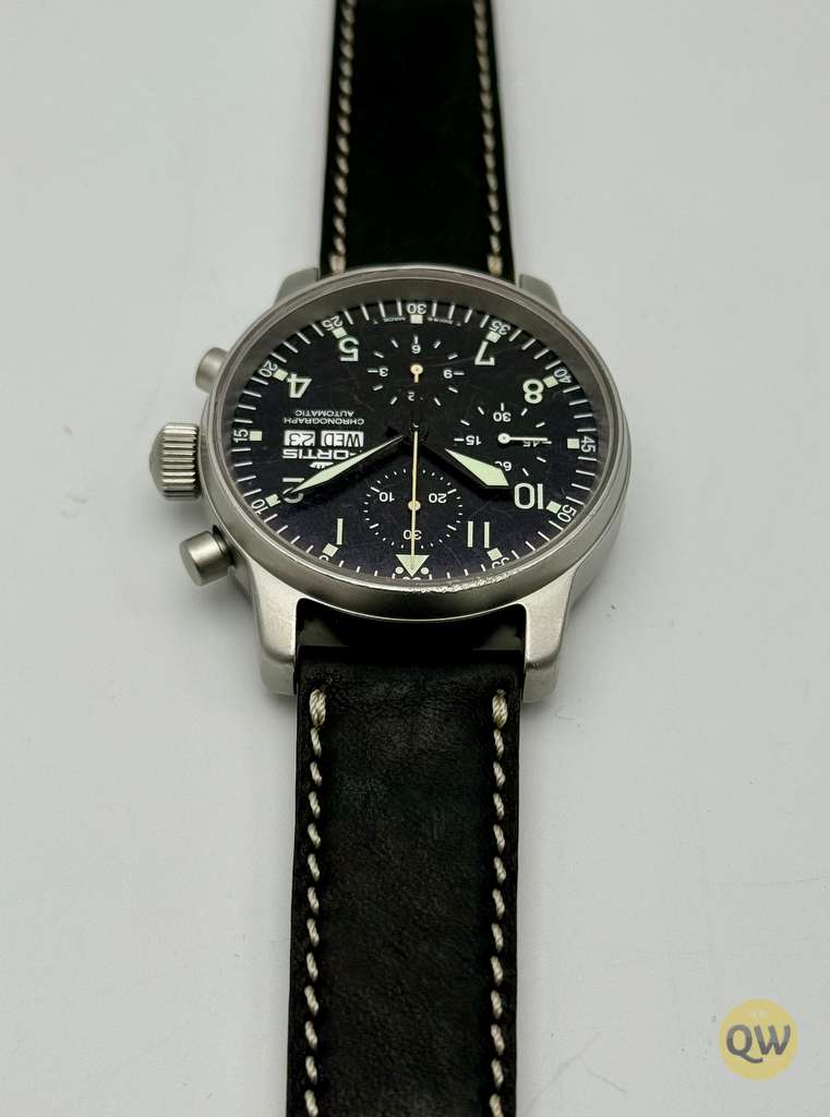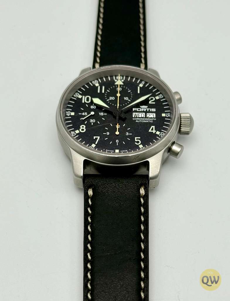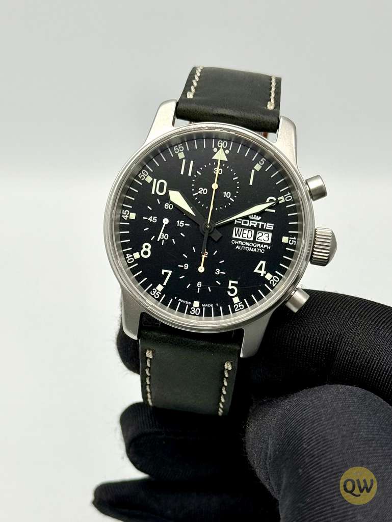 A sapphire crystal ensures scratch resistance and clarity. Water resistance is 50 meters. The watch is fitted on a black leather strap. This Fortis Flieger Chronograph is in used condition and comes in our Q-Watches travel pouch. Just came back from a fresh service. 1 year warranty.