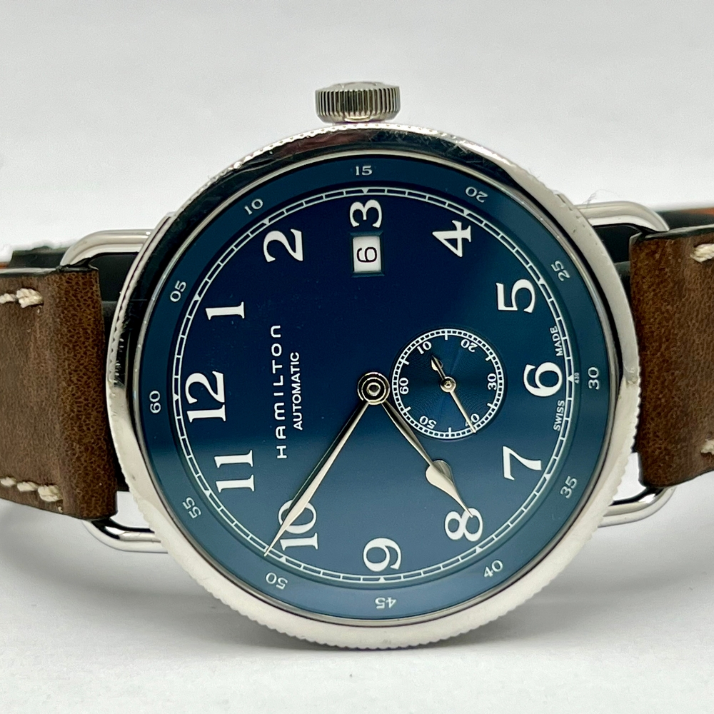 This Hamilton is the rare version with the blue dial and is in good condition, has some minor hairlines on the bezel. Comes in a generic box with a new generic strap on the original Hamilton clasp. 3 months warranty.