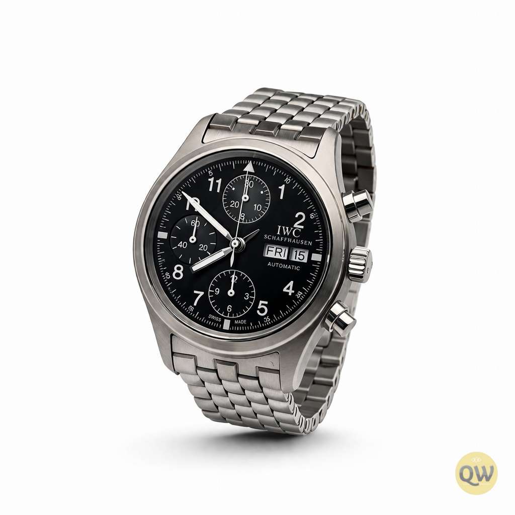 The IWC Pilot’s Watch Chronograph, reference IW3706-07, is a classic aviation chronograph combining robust construction with highly legible design. The watch features a 39 mm stainless steel case paired with a black dial. Luminous Arabic numerals, bold hands, and the clean chronograph layout ensure excellent legibility. Powered by the IWC caliber 7922 automatic movement, based on the Valjoux 7750, it offers a power reserve of approximately 44 hours, a frequency of 28,800 vph, and functions including chronograph and day-date. A sapphire crystal with anti-reflective coating protects the dial, while the smooth fixed bezel maintains its instrument-focused profile. Water resistance is rated at 60 meters. The watch is fitted on the IWC stainless steel bracelet with a folding clasp