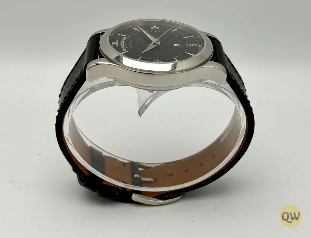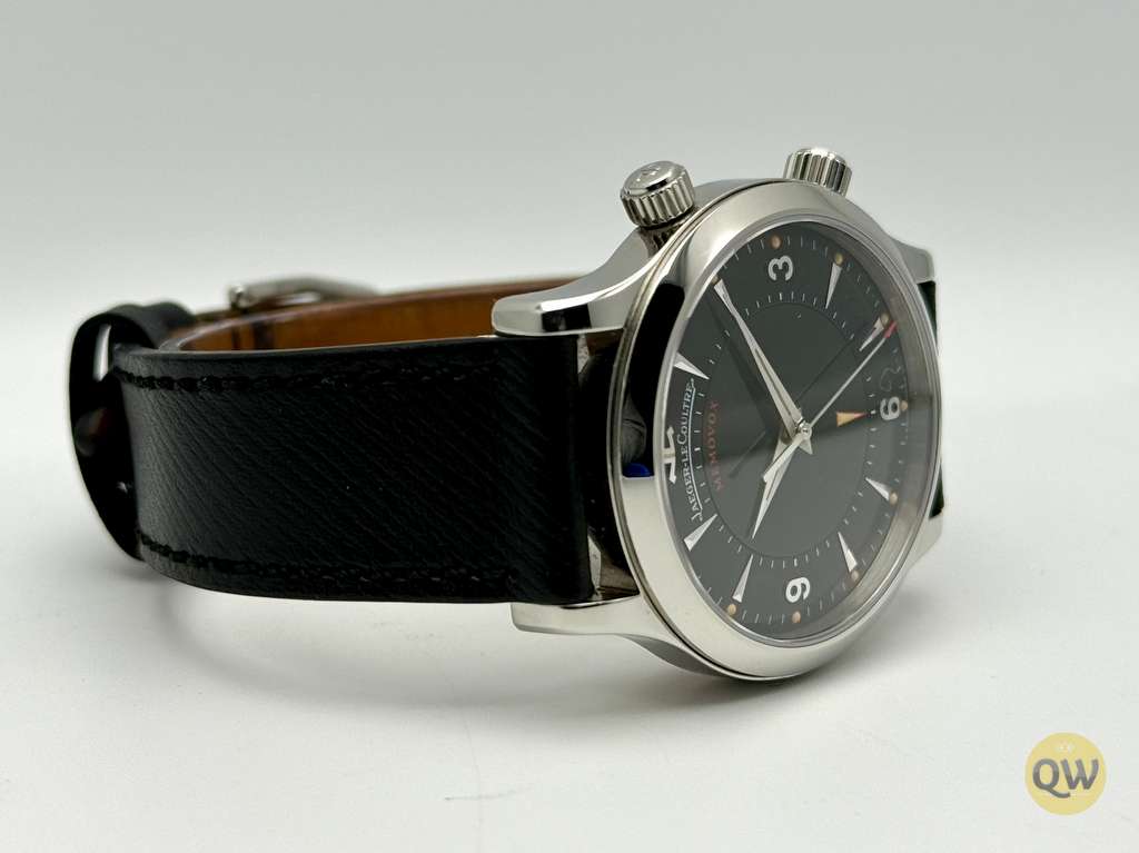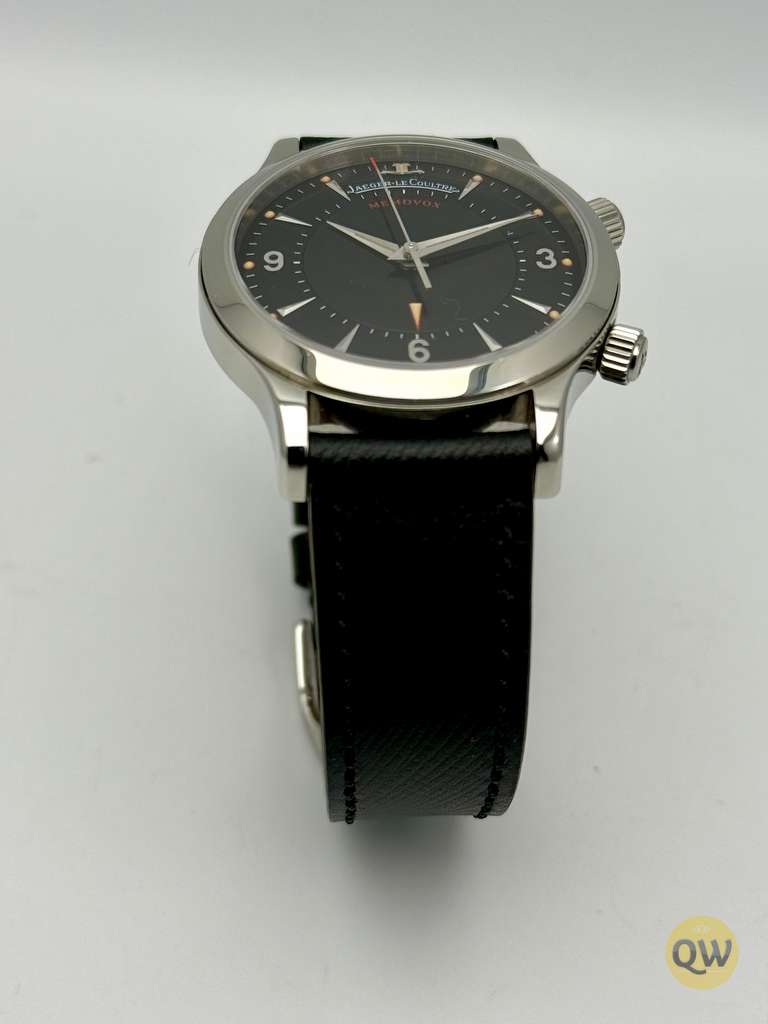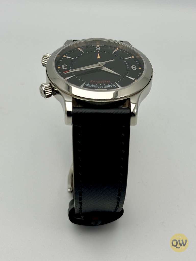 The Jaeger-LeCoultre Memovox, reference 144.8.945, is a refined dress watch featuring the brand’s signature alarm complication. The watch features a stainless steel case paired with a black dial. Applied hour markers, dauphine hands, and the inner rotating alarm disc create a clean yet functional layout. Powered by the Jaeger-LeCoultre caliber 916 automatic movement, it offers a power reserve of approximately 45 hours, a frequency of 28,800 vph, and functions including hours, minutes, seconds, date, and mechanical alarm. A sapphire crystal protects the dial, while the smooth fixed bezel enhances its elegant profile. Water resistance is rated at 50 meters. The watch is fitted on a black leather strap with a pin buckle.