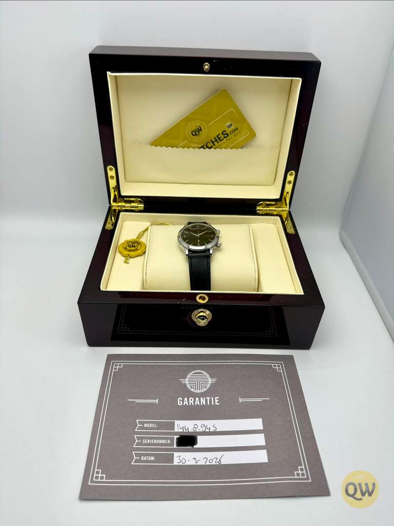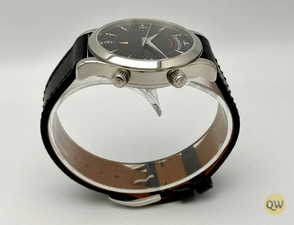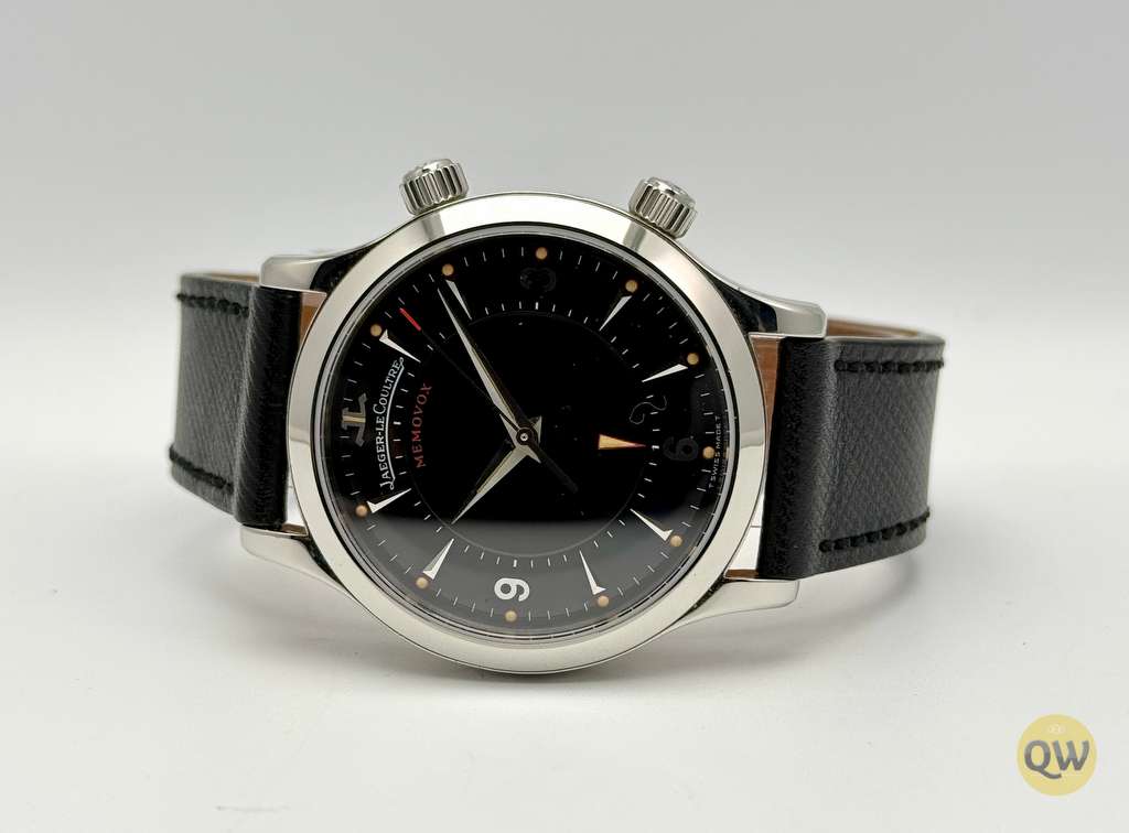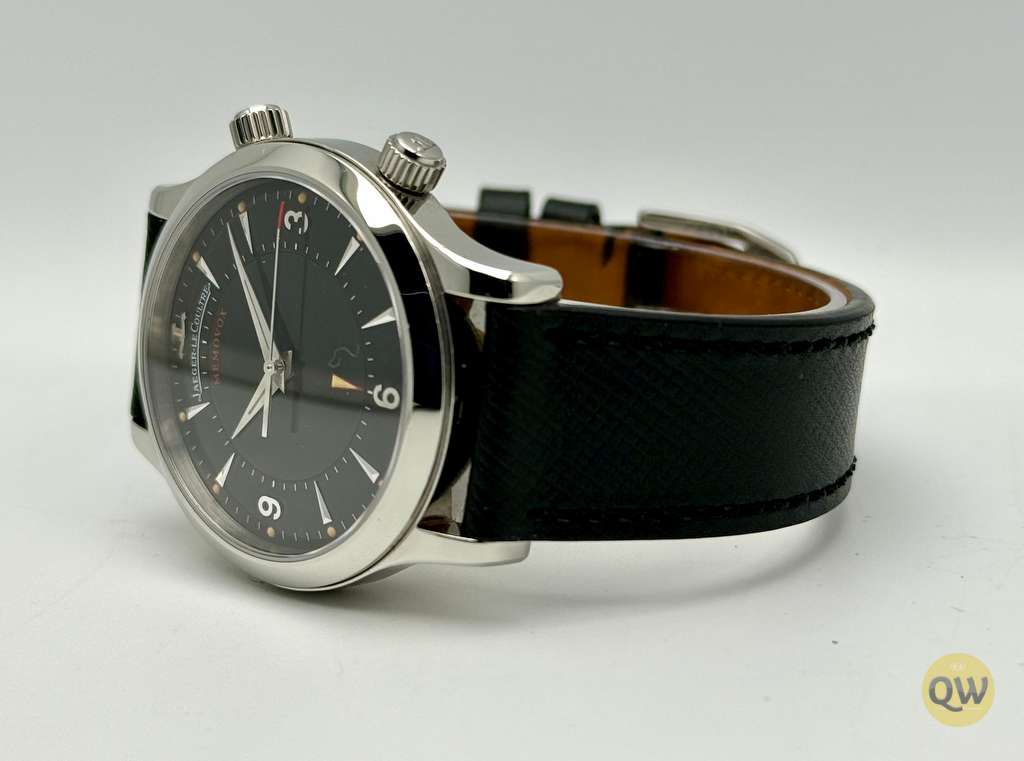 The Jaeger-LeCoultre Memovox, reference 144.8.945, is a refined dress watch featuring the brand’s signature alarm complication. The watch features a stainless steel case paired with a black dial. Applied hour markers, dauphine hands, and the inner rotating alarm disc create a clean yet functional layout. Powered by the Jaeger-LeCoultre caliber 916 automatic movement, it offers a power reserve of approximately 45 hours, a frequency of 28,800 vph, and functions including hours, minutes, seconds, date, and mechanical alarm. A sapphire crystal protects the dial, while the smooth fixed bezel enhances its elegant profile. Water resistance is rated at 50 meters. The watch is fitted on a black leather strap with a pin buckle.