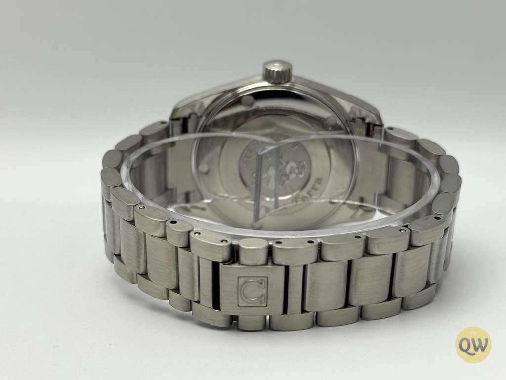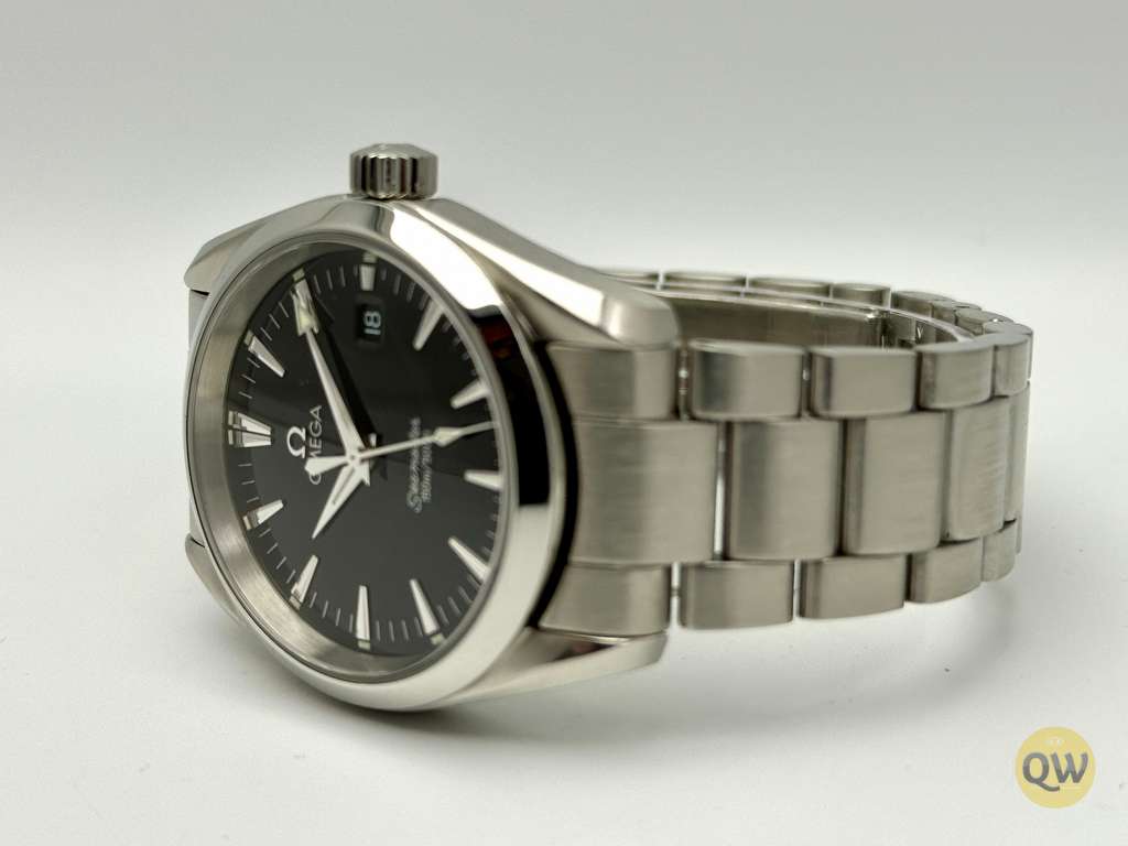 A scratch-resistant sapphire crystal with anti-reflective coating protects the dial, while the screw-down crown and 150 meters of water resistance make the Aqua Terra suitable for everyday use and light water activities.