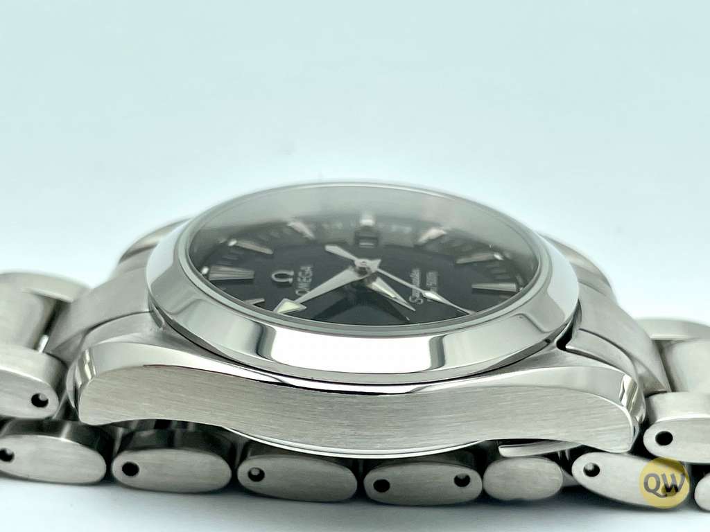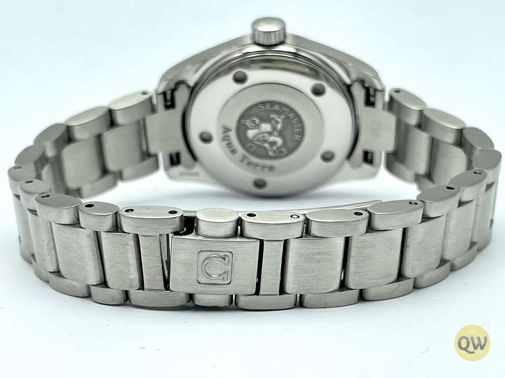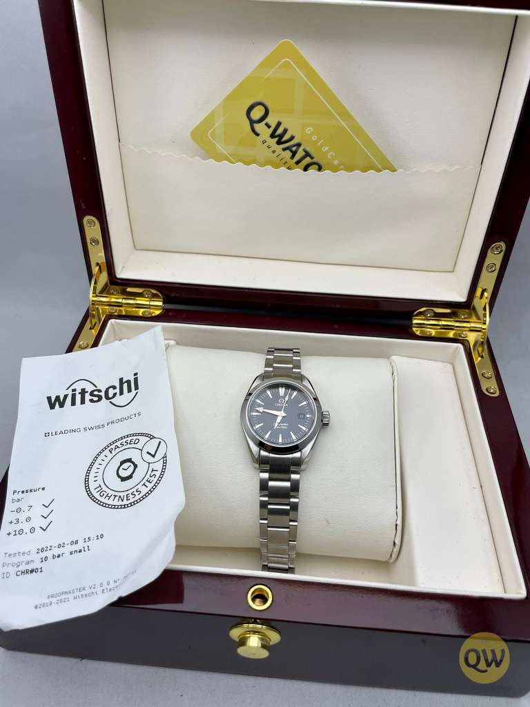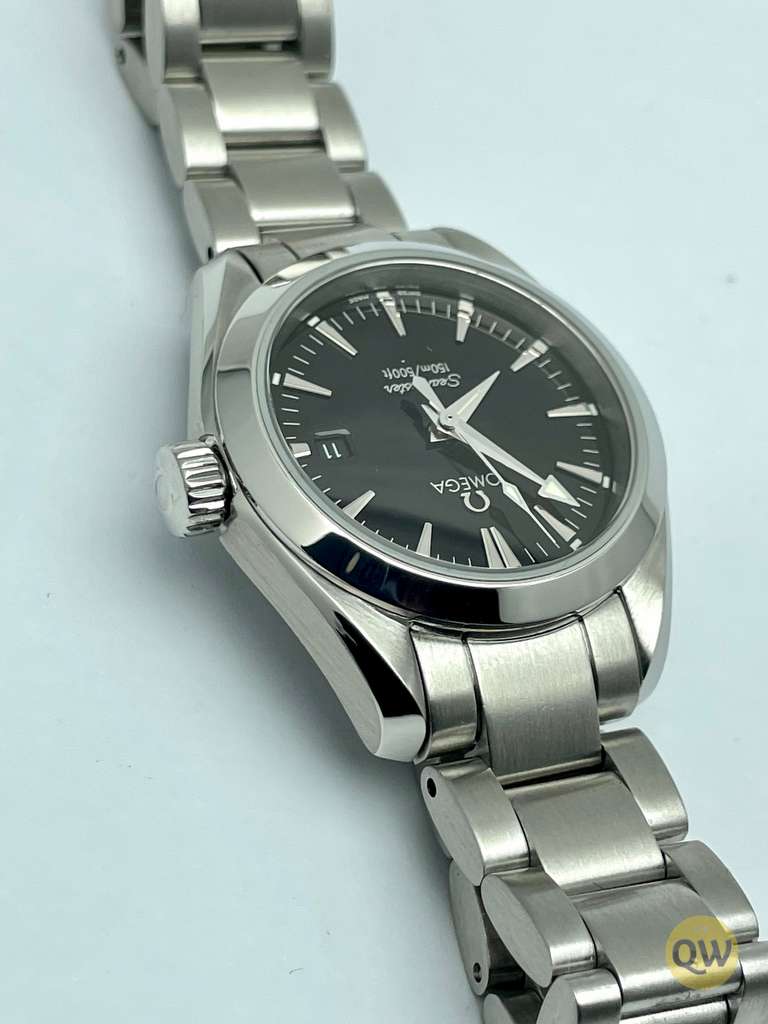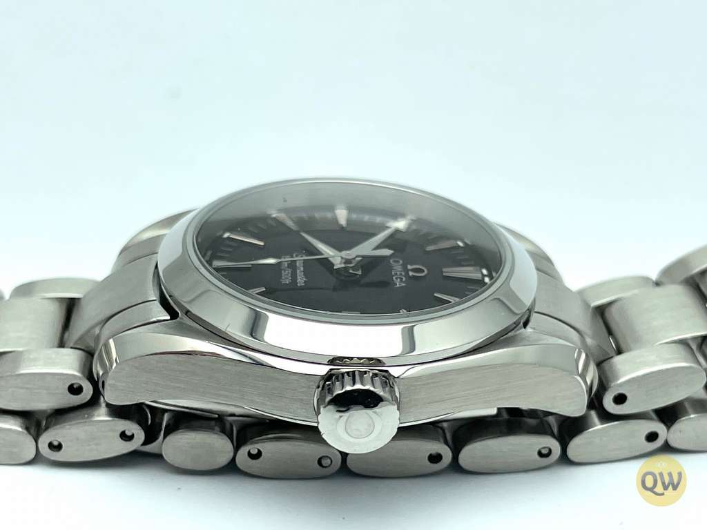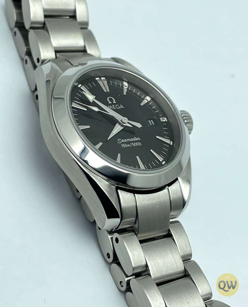 Pre-owned Omega Seamaster Aqua Terra Ladies Watch This Beautiful Timepiece is Powered by the Omega 1424 Quartz Movement And Features: Round Stainless Steel Case and Steel Bracelet witch will fit a lady’s wrist up to 18,5 cm, Fixed Smooth Stainless Steel Bezel, Sapphire Crystal, Black Dial with Silver-Tone Hands Arrow Shaped and Water Resistant up to 150 Meters.