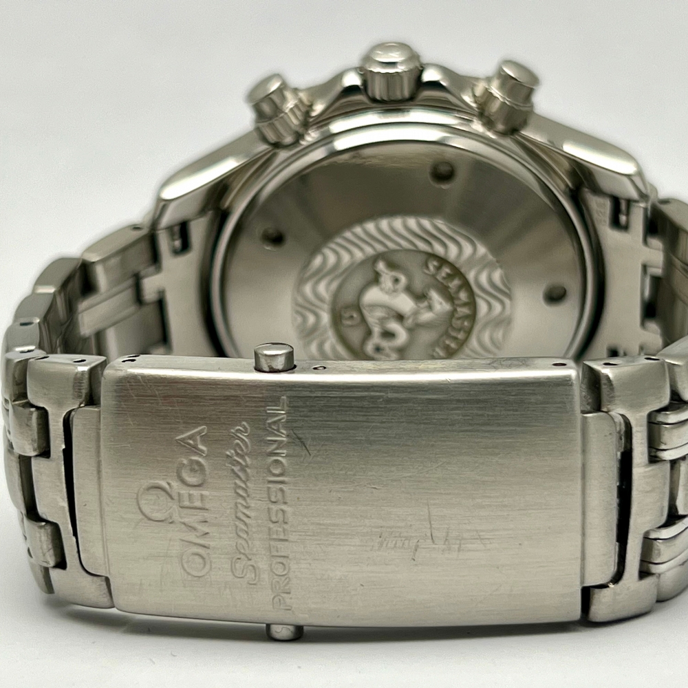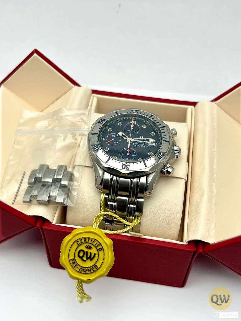 The Omega Seamaster 300M Chronograph is a true classic. It sports an understated color palette, accented with red on the minor hands—seconds hand and chronograph subdials—echoing the style of the iconic James Bond Seamasters. The "ball triangle" major hands add a distinctive touch. Each hour marker is paired with a luminous pip, while the inner bezel features a detailed seconds scale. The outer bezel includes seconds markers, topped with a triangle marker on the chronograph bezel for precise measurement.