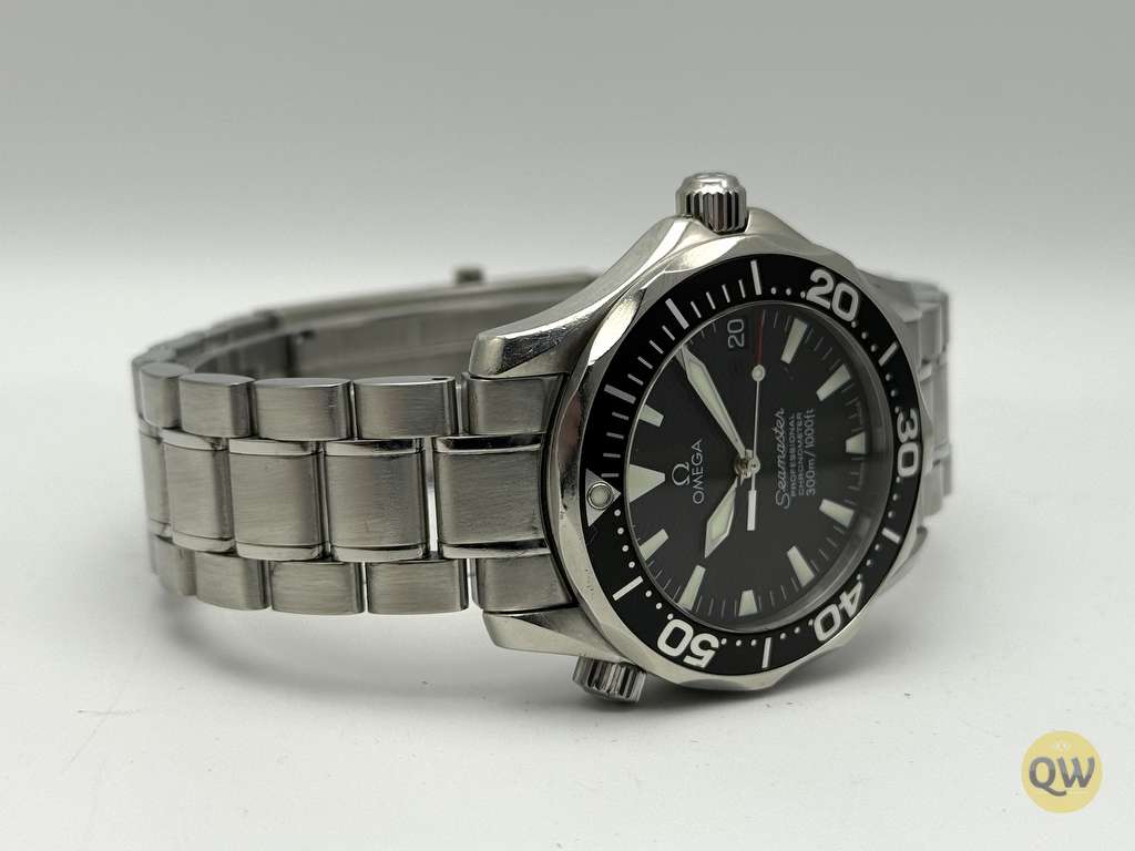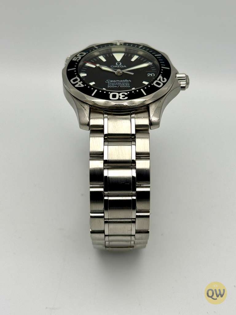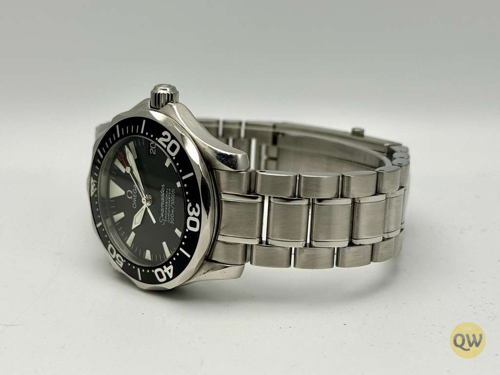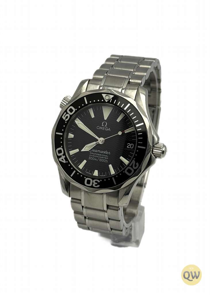 The Omega Seamaster Mid Size Automatic, reference 2252.50.00, is a compact diver’s watch that offers the classic Seamaster design in more wearable proportions. The watch features a 36.25 mm stainless steel case paired with a black wave-pattern dial. Luminous skeleton hands, applied hour markers, and strong contrast ensure excellent legibility. Powered by the Omega caliber 1120 automatic movement, based on the ETA 2892-A2, it offers a power reserve of approximately 44 hours, a frequency of 28,800 vph, and functions including hours, minutes, seconds, and date. A sapphire crystal protects the dial, while the unidirectional rotating bezel supports precise dive timing. Water resistance is rated at 300 meters. The watch is fitted on a stainless steel bracelet with a folding clasp.