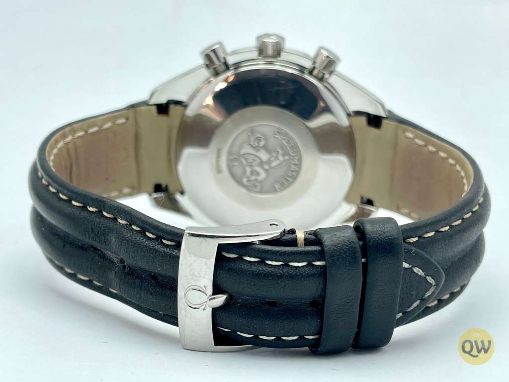 The chronograph subdials display seconds, minutes, and hours. Leather strap with Omega buckle. Automatic Caliber Omega 1151 automatic self-winding movement with 44-hour power reserve.