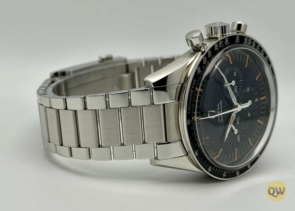 A sapphire crystal on the front ensures clarity and scratch resistance, while the sapphire exhibition case back reveals the beautifully finished movement and special engravings dedicated to the “First OMEGA in Space” theme. The black aluminum tachymeter bezel with “Dot Over Ninety” maintains the classic Speedmaster identity. Water resistance of 50 meters and the compact case size make this model versatile for daily wear. The watch is fitted on a stainless steel flat-link bracelet with Omega’s comfort release adjustment system.