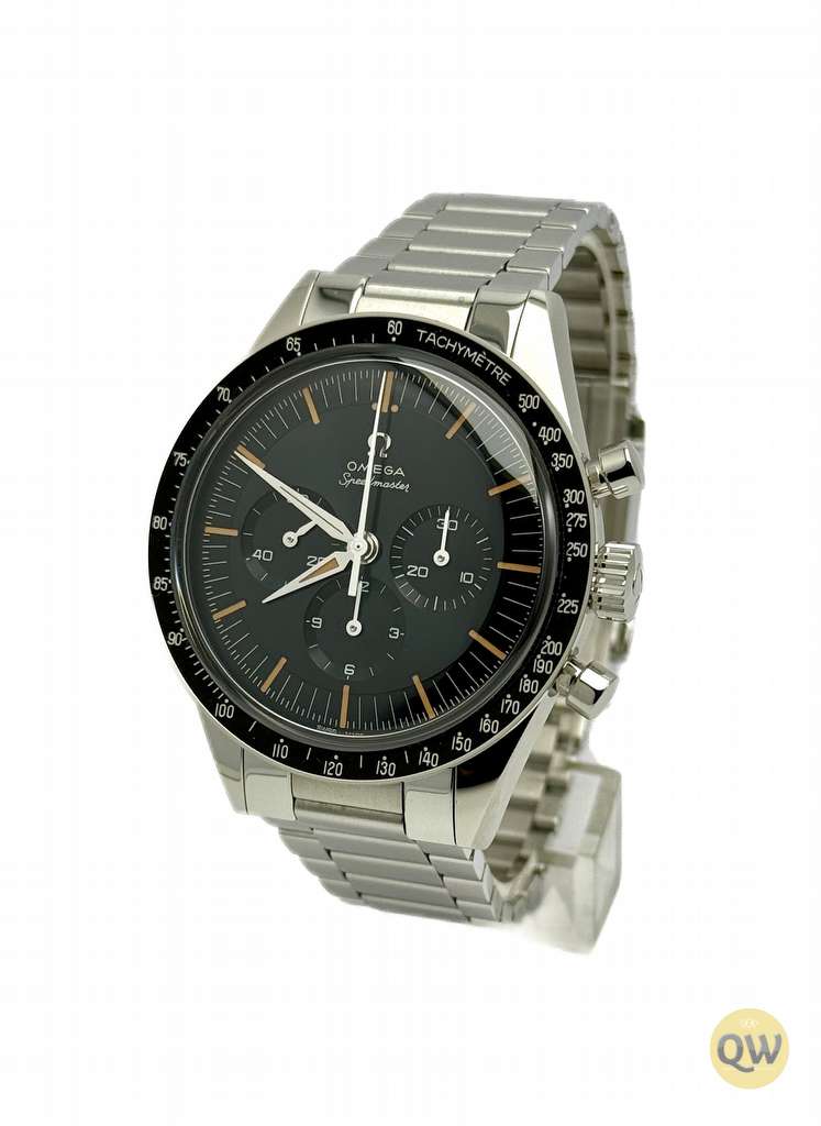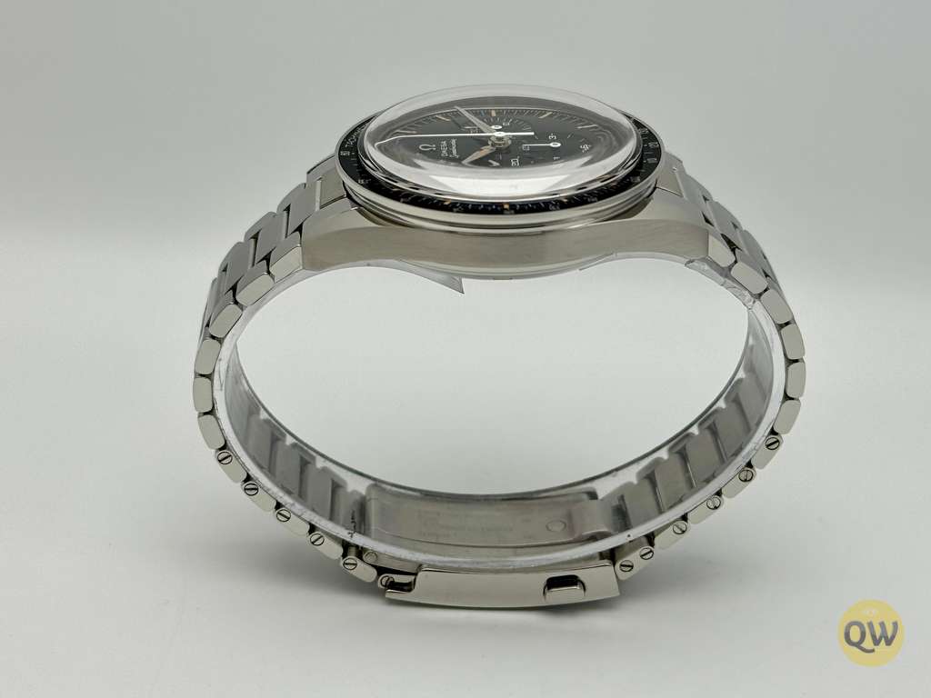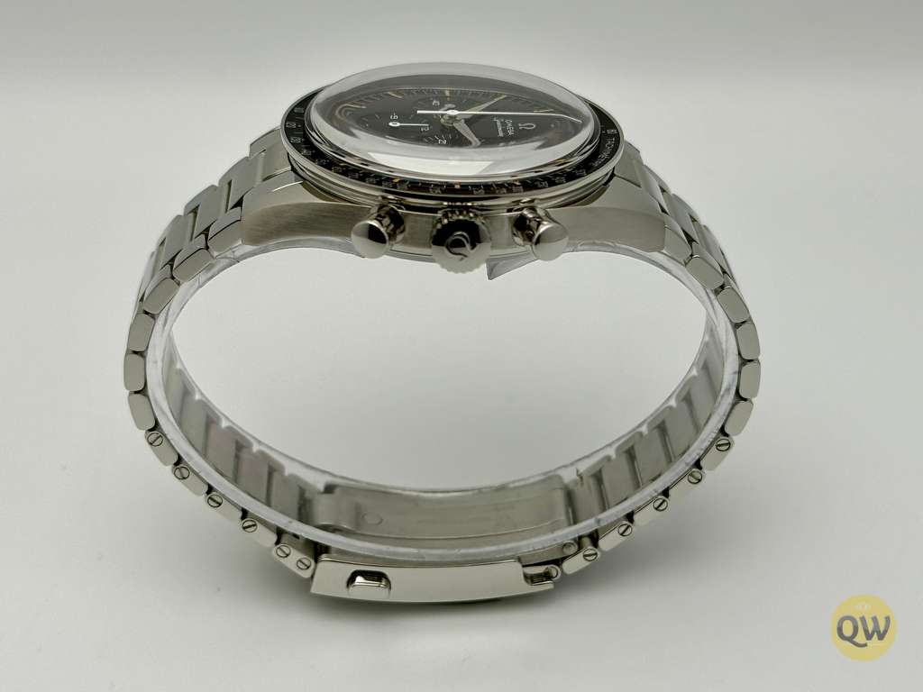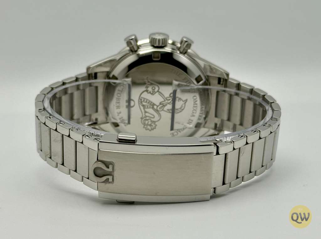 A sapphire crystal on the front ensures clarity and scratch resistance, while the sapphire exhibition case back reveals the beautifully finished movement and special engravings dedicated to the “First OMEGA in Space” theme. The black aluminum tachymeter bezel with “Dot Over Ninety” maintains the classic Speedmaster identity. Water resistance of 50 meters and the compact case size make this model versatile for daily wear. The watch is fitted on a stainless steel flat-link bracelet with Omega’s comfort release adjustment system.
