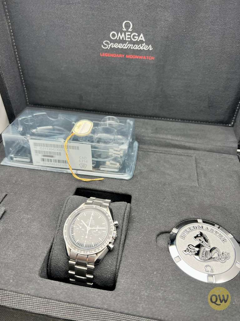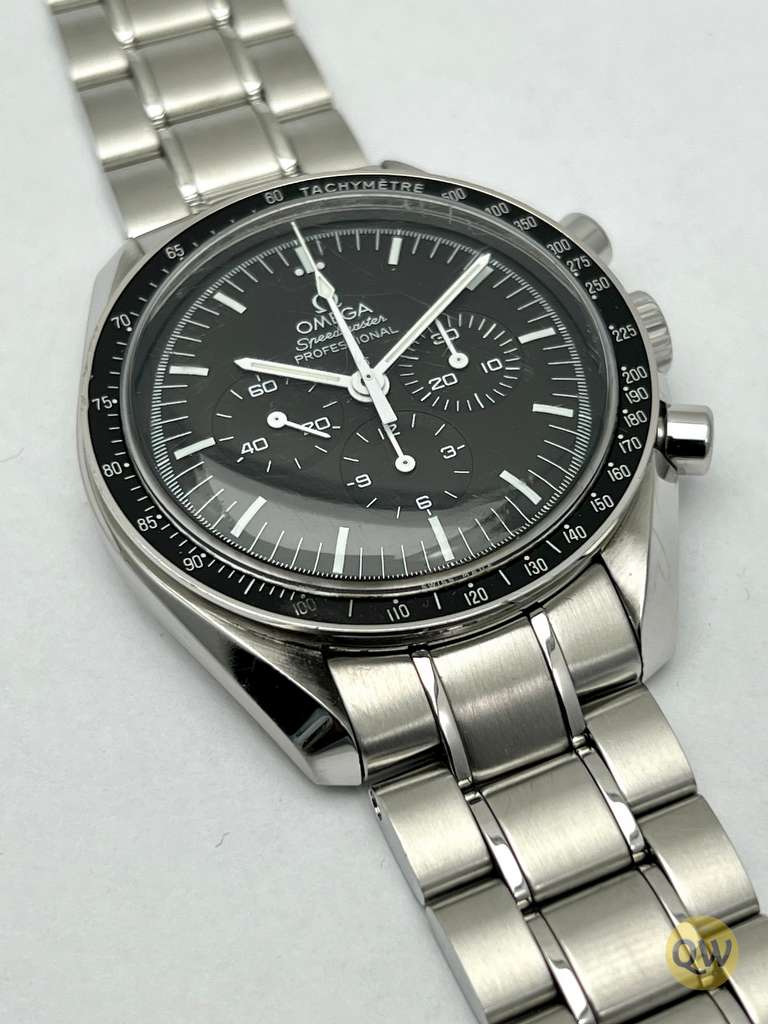 The Speedmaster Moonwatch is one of the world’s most iconic timepieces. Having been a part of all six moon landings, the legendary chronograph is an impressive representation of the brand’s adventurous pioneering spirit.This Omega Speedmaster Professional “Moonwatch” features a black dial covered by a hesalite crystal and graced by a small seconds sub-dial, 30-minute recorder and 12-hour recorder along with a central chronograph hand. The black bezel, with its tachymetric scale, is mounted on a 42 mm stainless steel case and presented on a matching bracelet.