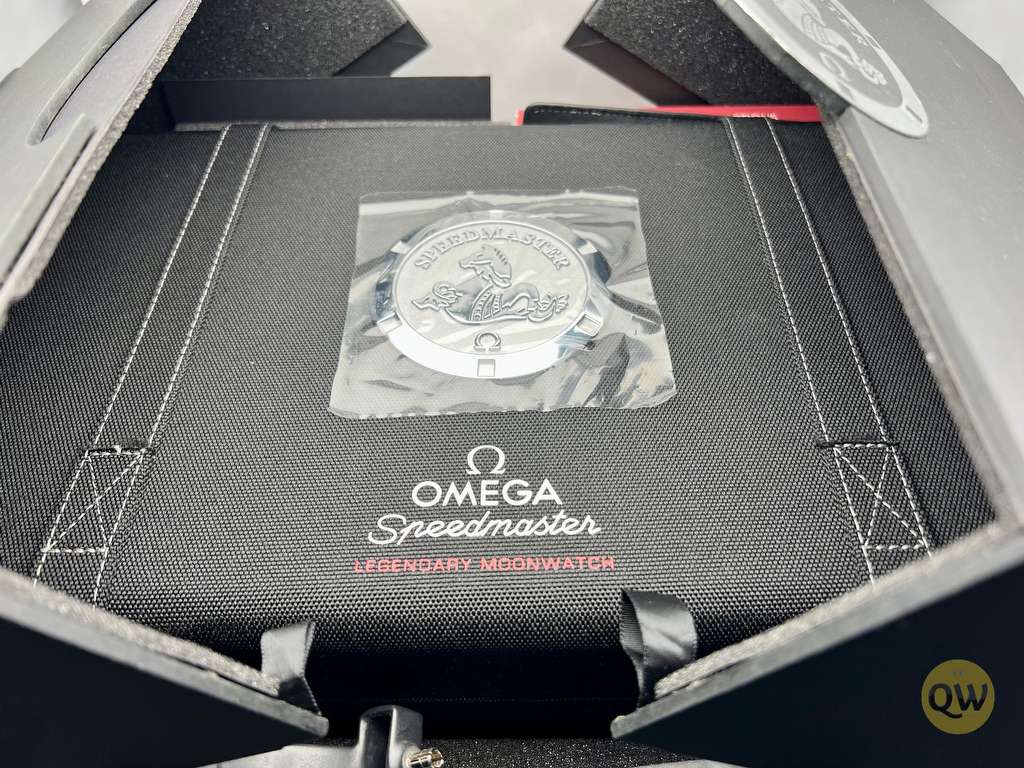 This Speedmaster comes as a full set with all the extra's that was delivered from the first purchase. The dealer transport box is present as well. The watch is in fair condition with a dent in the bezel at 10/11 position. Has some small traces of use on the case. Iconic watch!