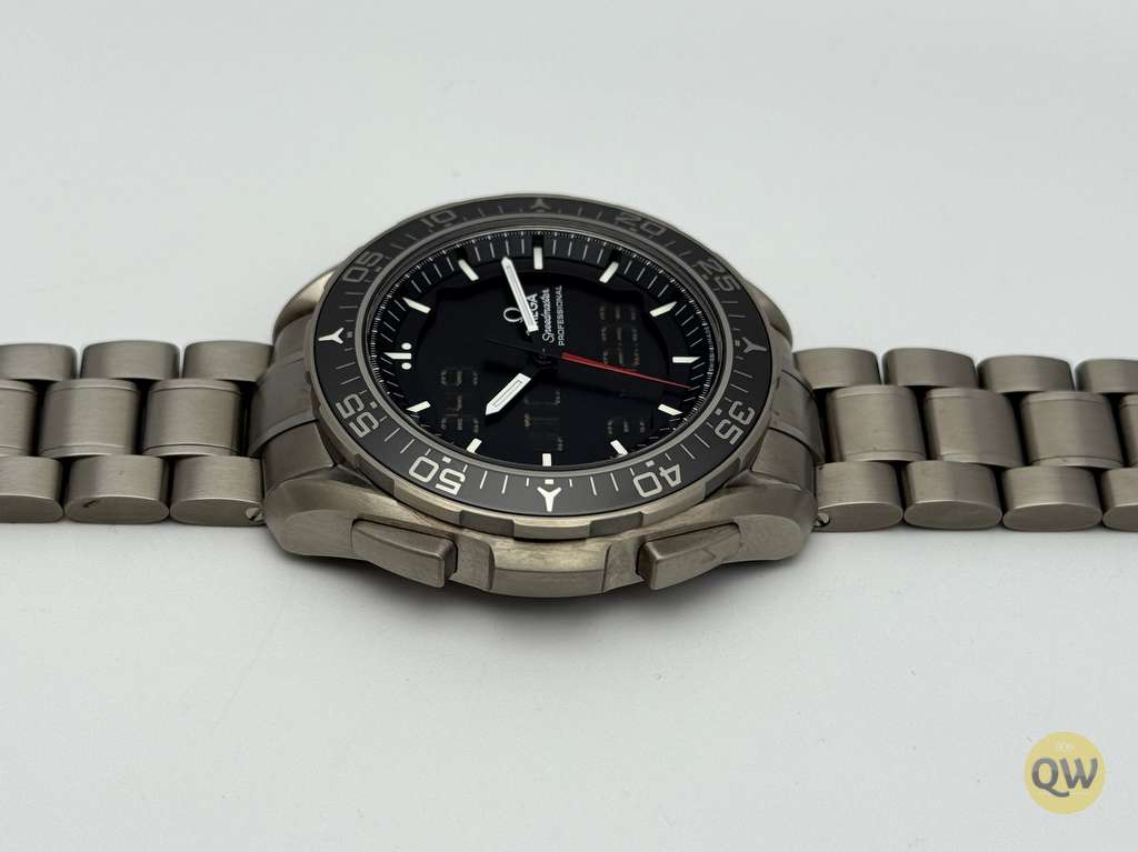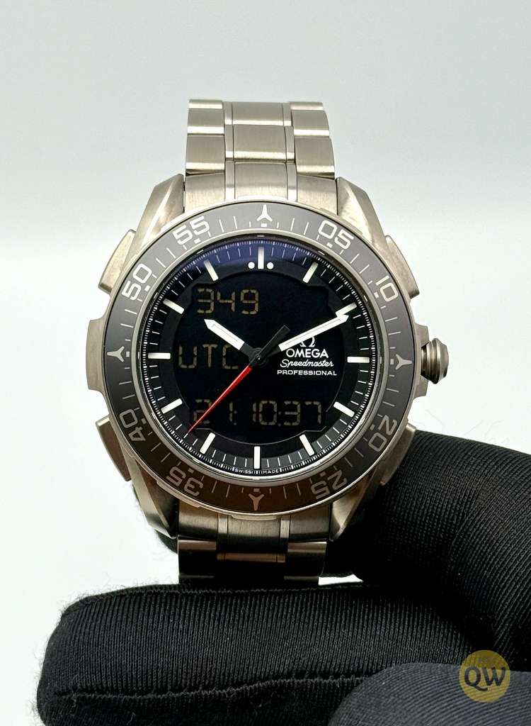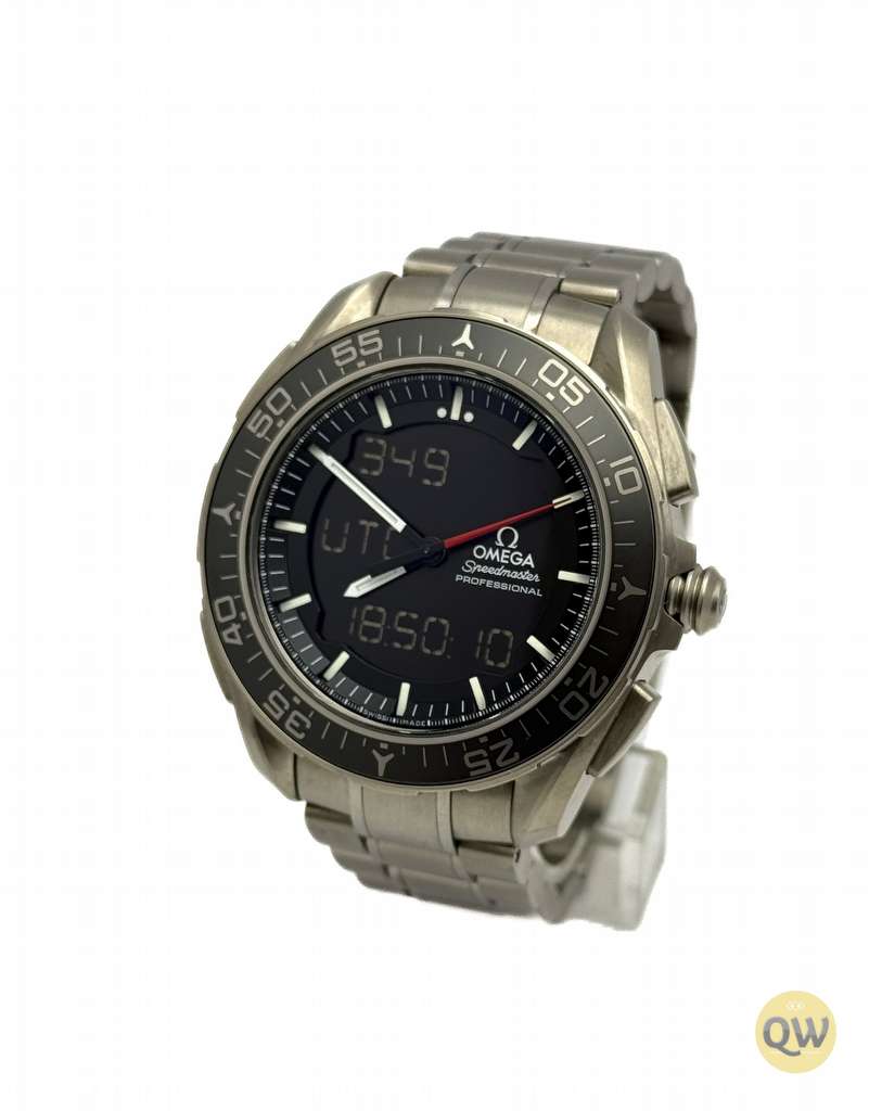 The Omega Speedmaster Skywalker X-33, reference 318.90.45.79.01.001, features a 45 mm titanium case with a matte black dial and dual LCD displays for mission-critical information at a glance. Powered by the high-precision Omega caliber 5619 thermo-compensated quartz movement, it offers outstanding accuracy and a comprehensive suite of functions including chronograph, multiple alarms, GMT/second time zone, perpetual calendar, and mission/flight-time features.