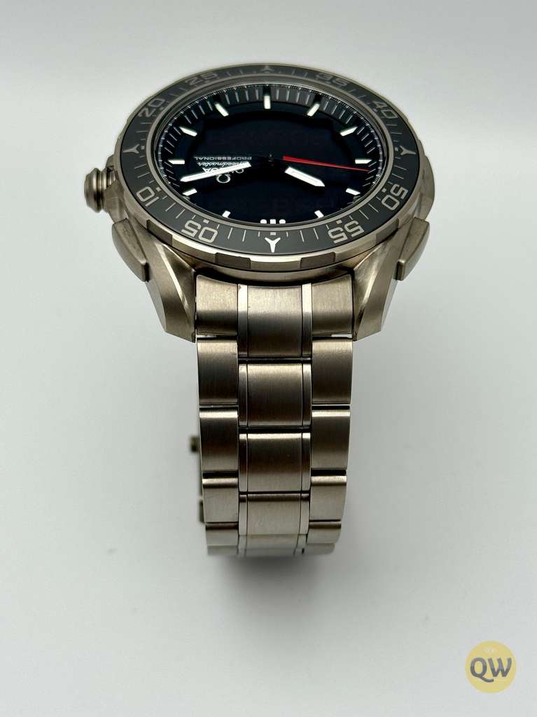 A scratch-resistant sapphire crystal with anti-reflective coating ensures clarity, while the bidirectional rotating bezel enhances practical timing use. With 30 meters of water resistance, the watch is engineered as a professional aerospace instrument for daily wear rather than diving. This model is fitted on a titanium bracelet with a folding clasp, delivering lightweight comfort and strong durability.