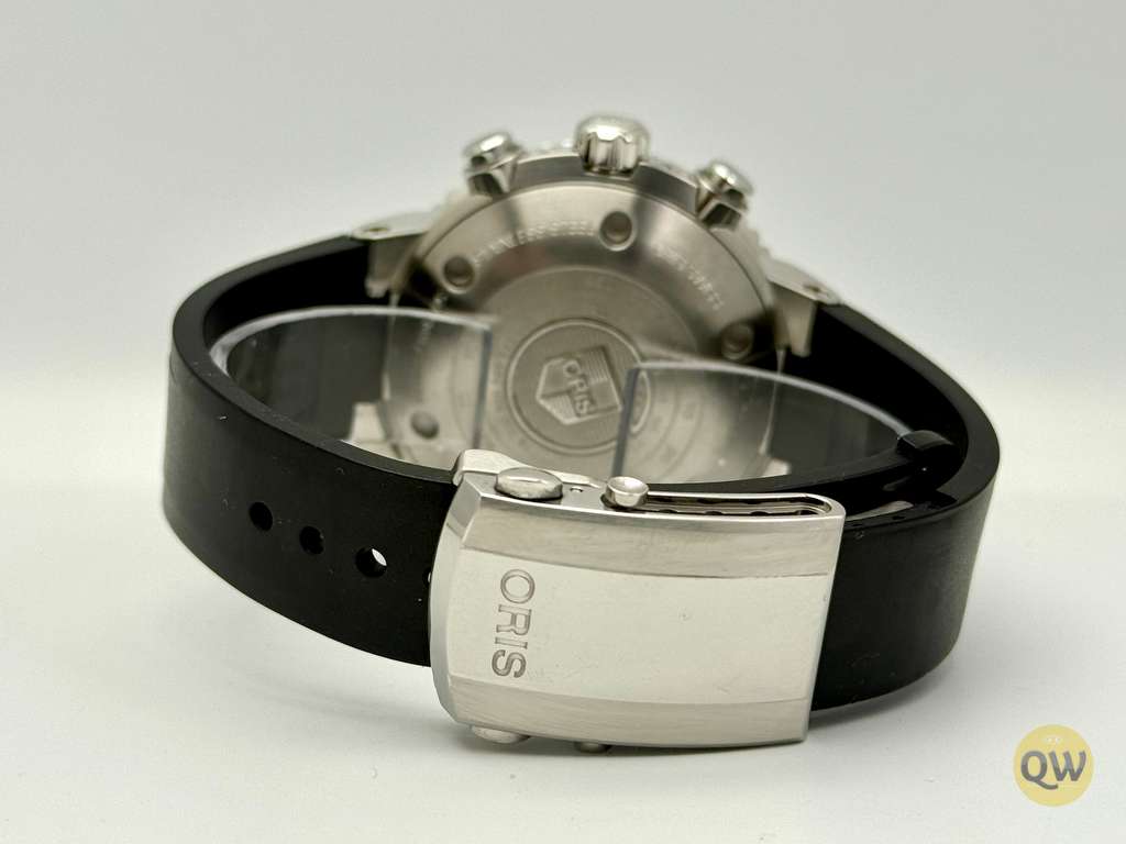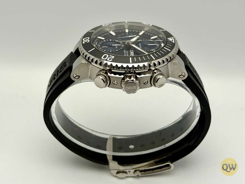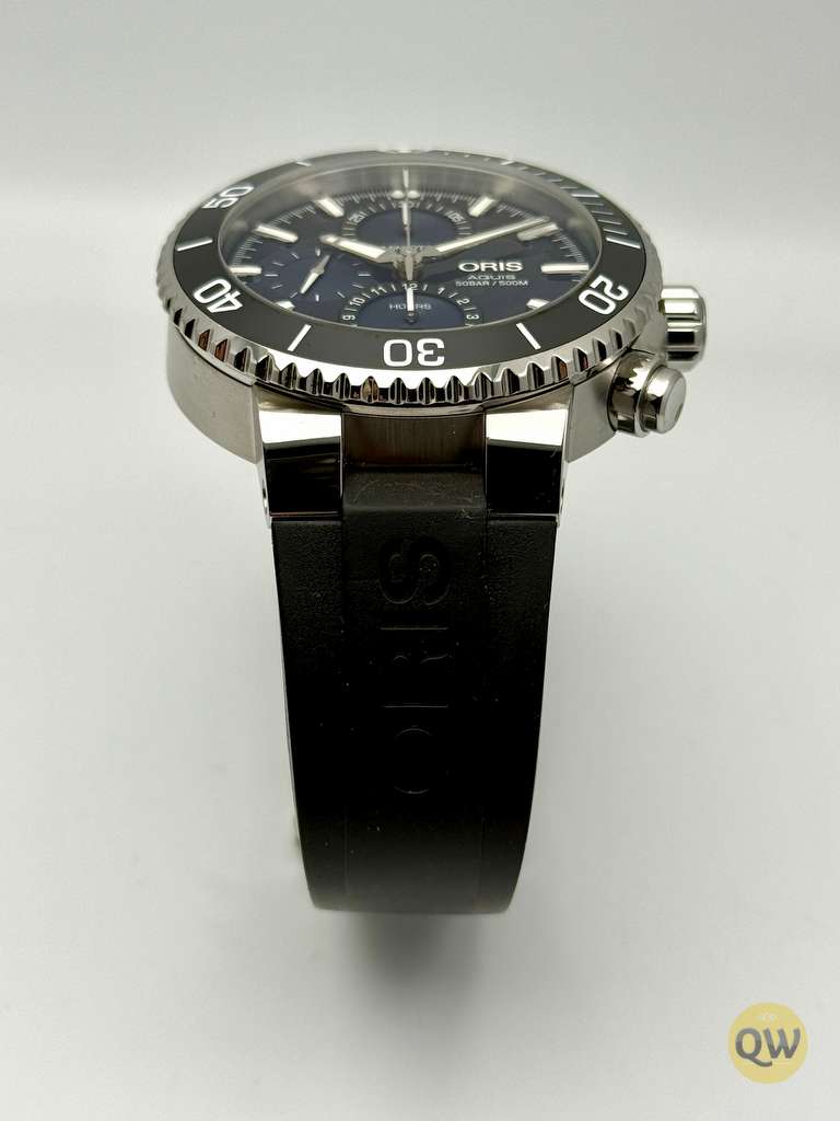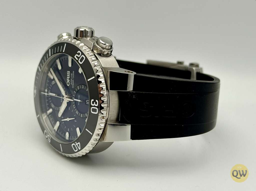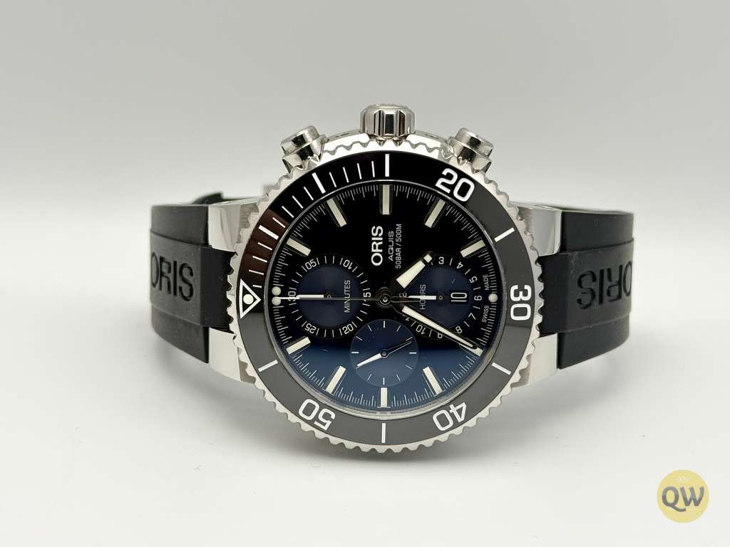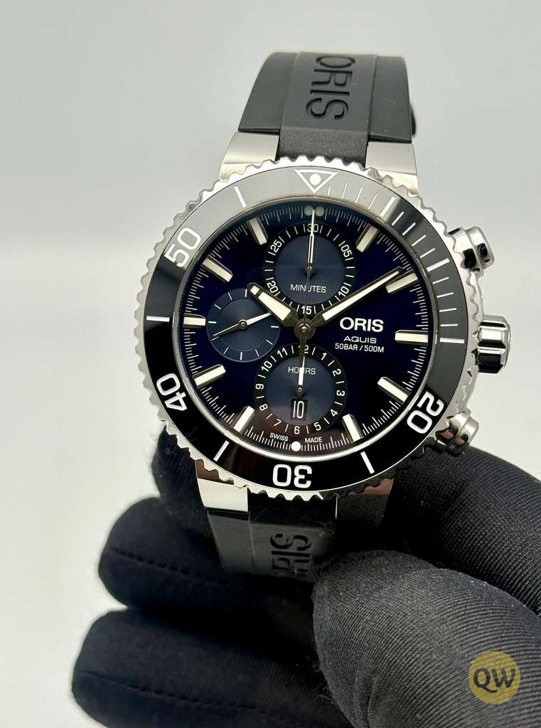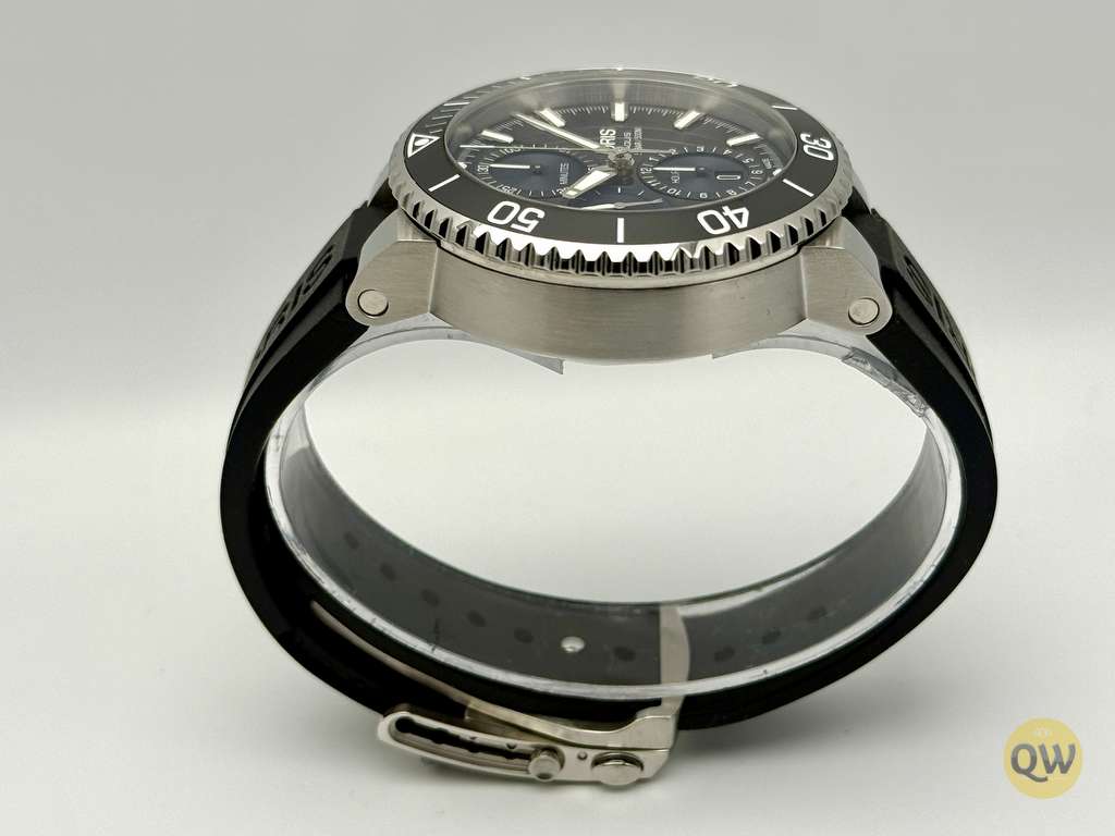The Oris Aquis Chronograph, reference 01 774 7743 4155, features a 45.5 mm stainless steel case with a black sunray dial, large luminous hands, and applied hour markers for excellent underwater visibility. Powered by the Oris caliber 774 automatic chronograph movement (based on the Sellita SW500, with a 48-hour power reserve and a frequency of 28,800 vph), it offers central chronograph seconds, 30-minute and 12-hour counters, small seconds, and a date display at 6 o’clock.