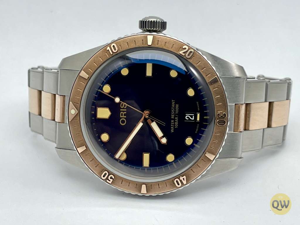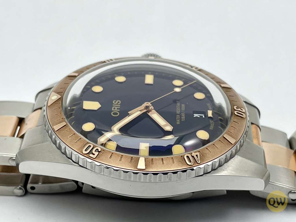 The Diver's Sixty Five is a coveted collector's item among horology buffs for its exquisite, vintage-inspired design that blends retro dive watch features with modern amenities. Among the most notable is the dial, which is topped with older-style hour markers and hands. While the Superluminova plots are a modern addition, the luminous material features a "Light Old Radium" hue to mirror the patina that might be found on a vintage watch. Additionally, this Oris diver features a domed sapphire crystal, giving it the illusion of Hesalite.