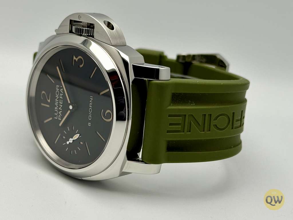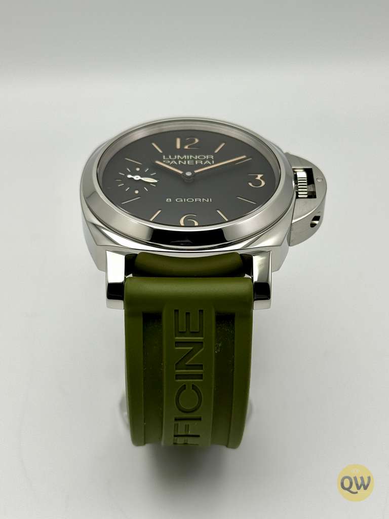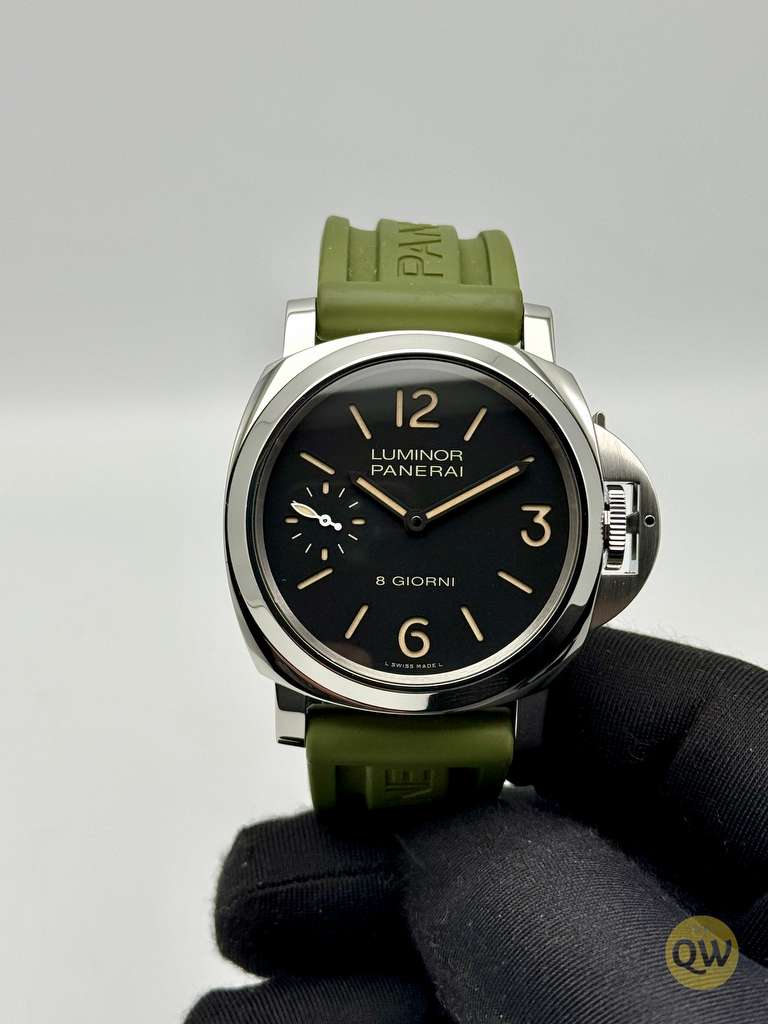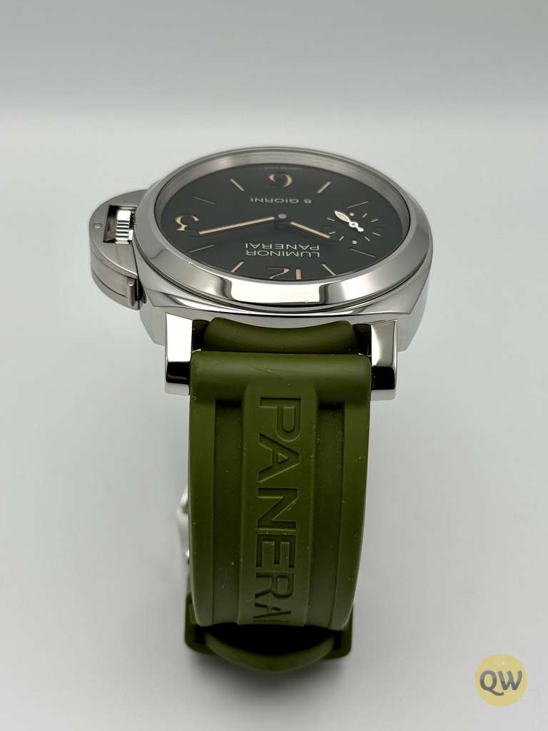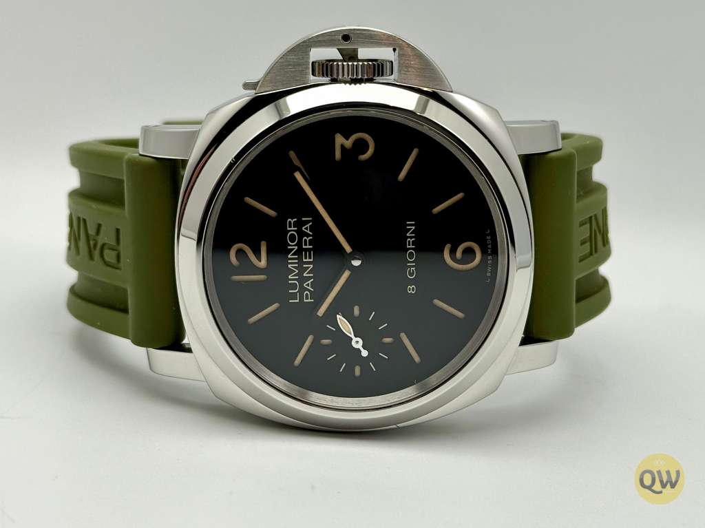This Luminor 8 Days is in near mint condition (small imperfection on the bezel between 1 and 2 marker) and comes with our QW wooden box. Rubber and green Aron Bespoke canvas strap. 3 months warranty.