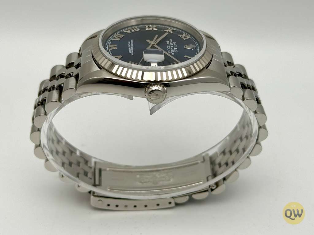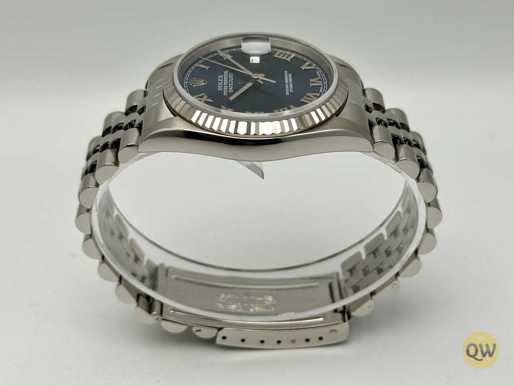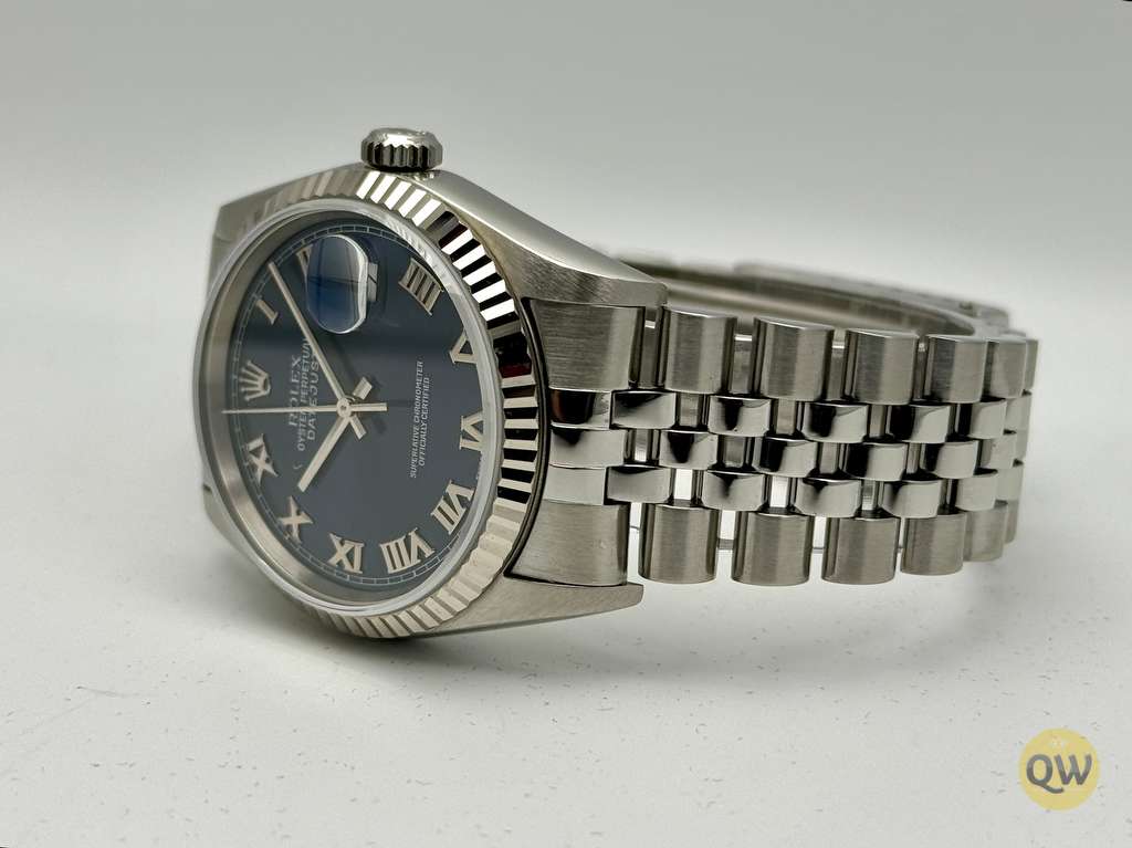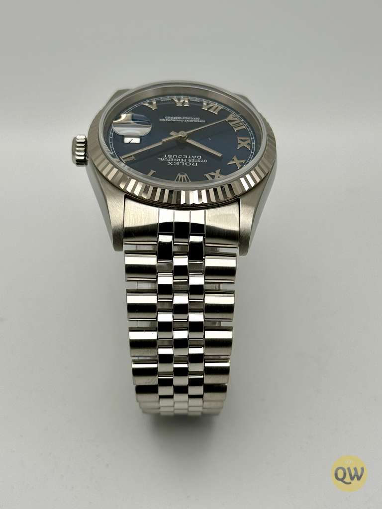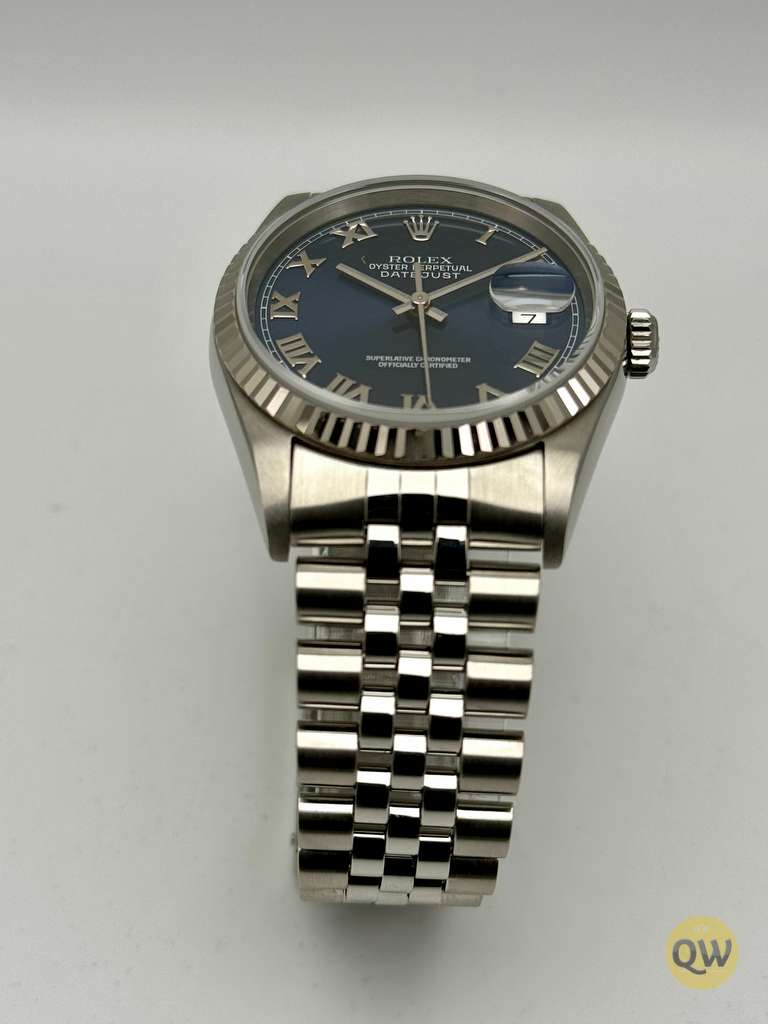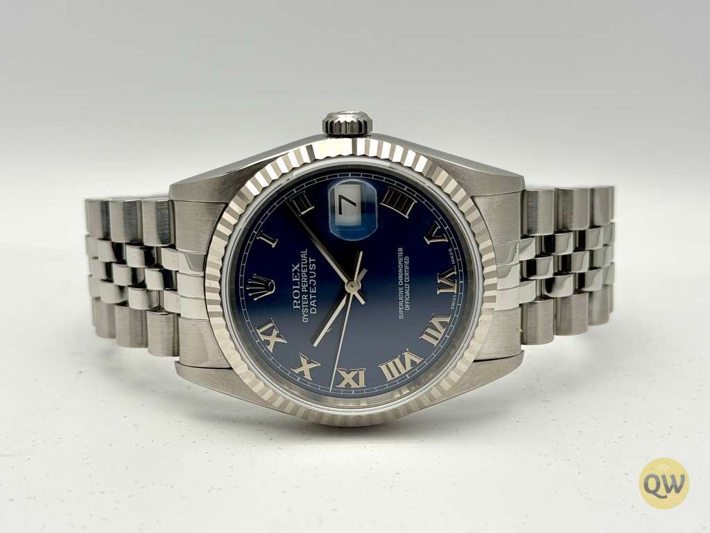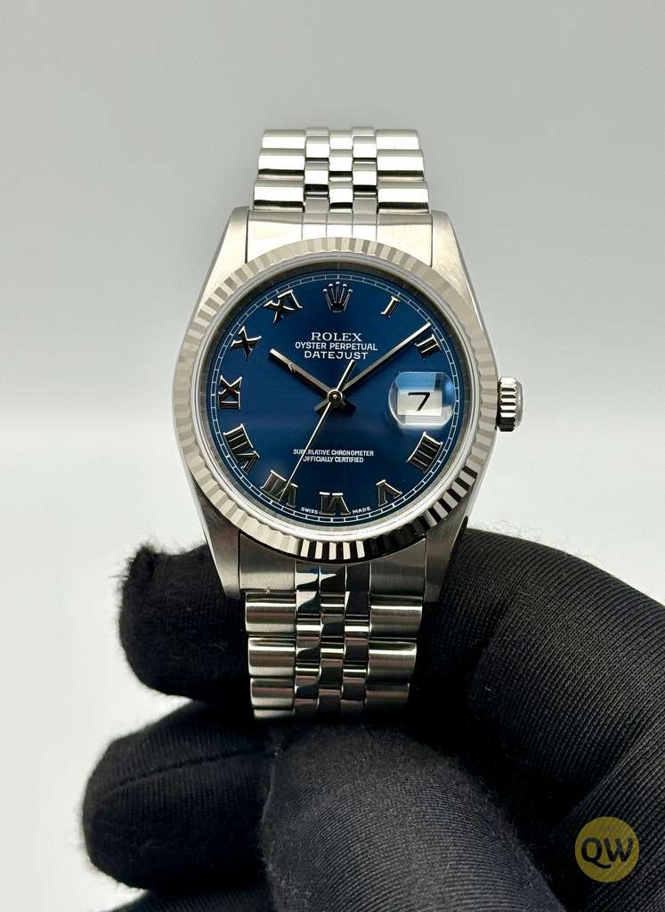 The Rolex Datejust 36, reference 16234, is a classic everyday watch that balances elegance with robustness. The watch features a 36 mm stainless steel case paired with a blue dial. Applied hour markers, polished hands, and the signature fluted white gold bezel create a refined and recognizable aesthetic. Powered by the Rolex caliber 3135 automatic movement, it offers a power reserve of approximately 48 hours, a frequency of 28,800 vph, and functions including hours, minutes, seconds, and date. A sapphire crystal protects the dial, while the fluted bezel enhances its classic Rolex identity. Water resistance is rated at 100 meters. The watch is fitted on a stainless steel Jubilee bracelet with a folding clasp.