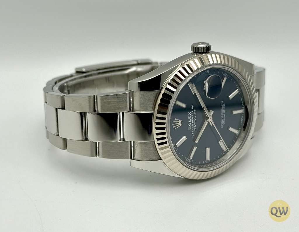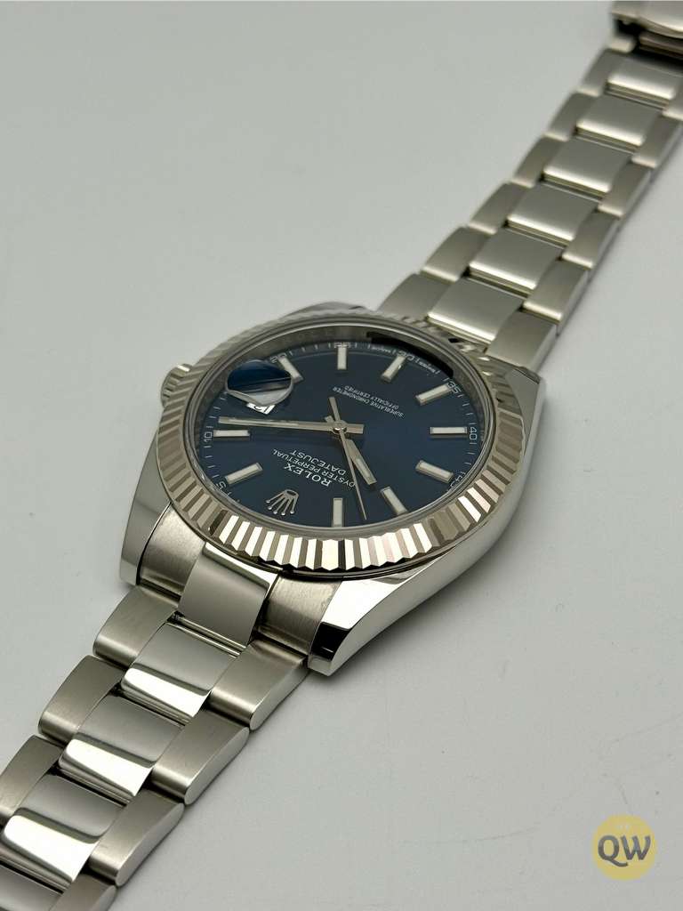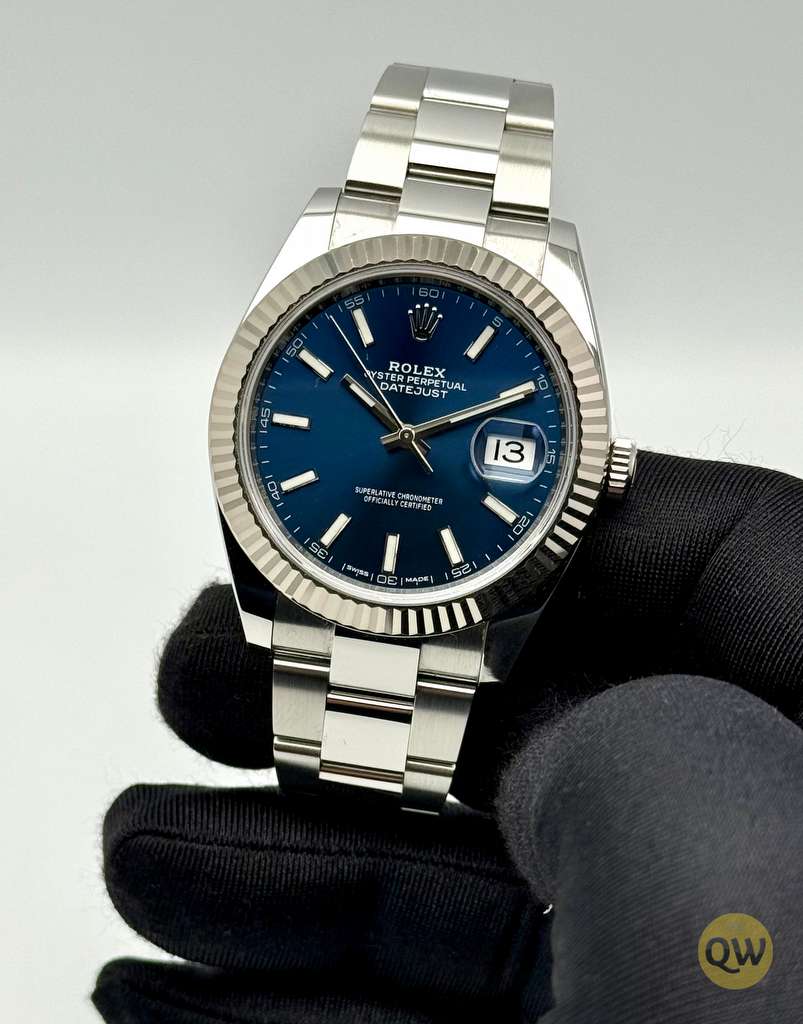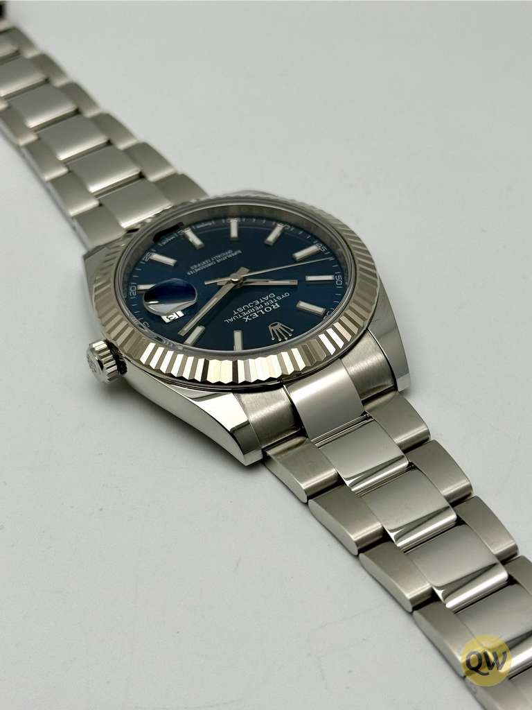 The Rolex Datejust 41 referece 126334 features a 41 mm Oystersteel case paired with an 18k white gold fluted bezel — a hallmark of Rolex craftsmanship. Its elegant blue sunray dial is complemented by luminous baton hour markers and hands, offering perfect legibility and sophistication. Powered by the in-house Rolex caliber 3235 automatic movement, it delivers a 70-hour power reserve, a frequency of 28,800 vph, and is officially certified as a Superlative Chronometer (COSC + Rolex standards)