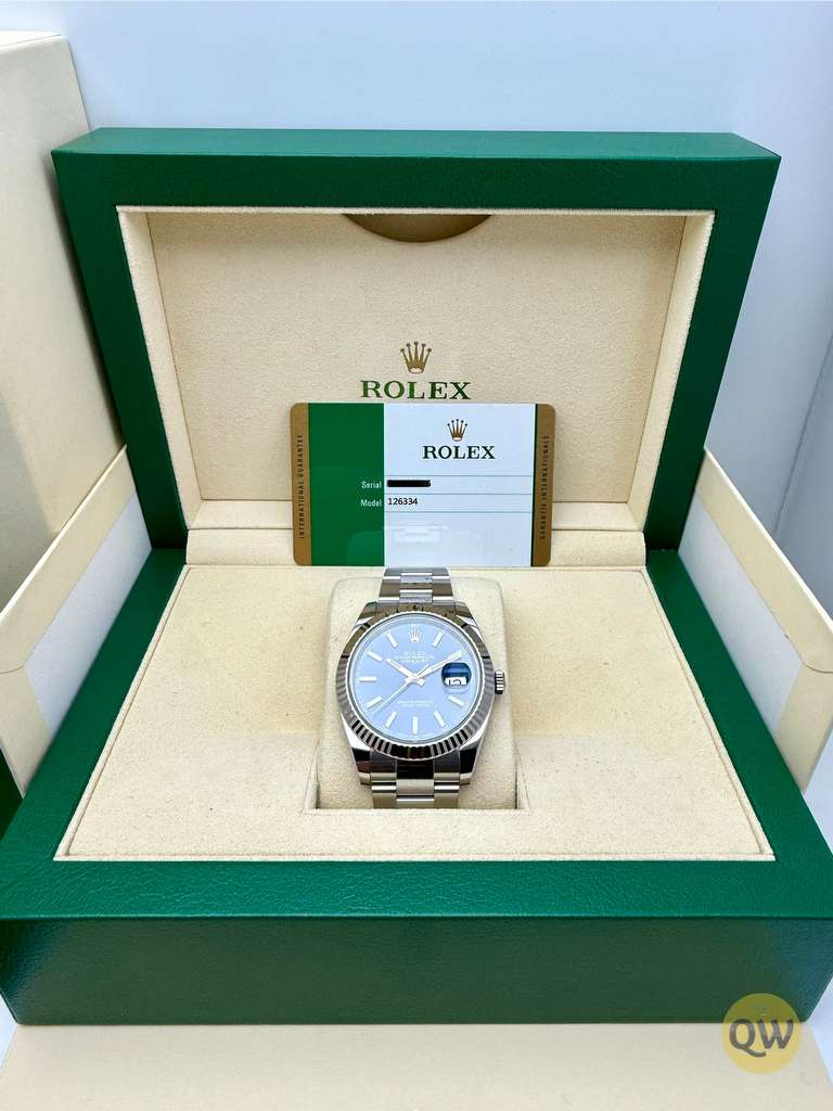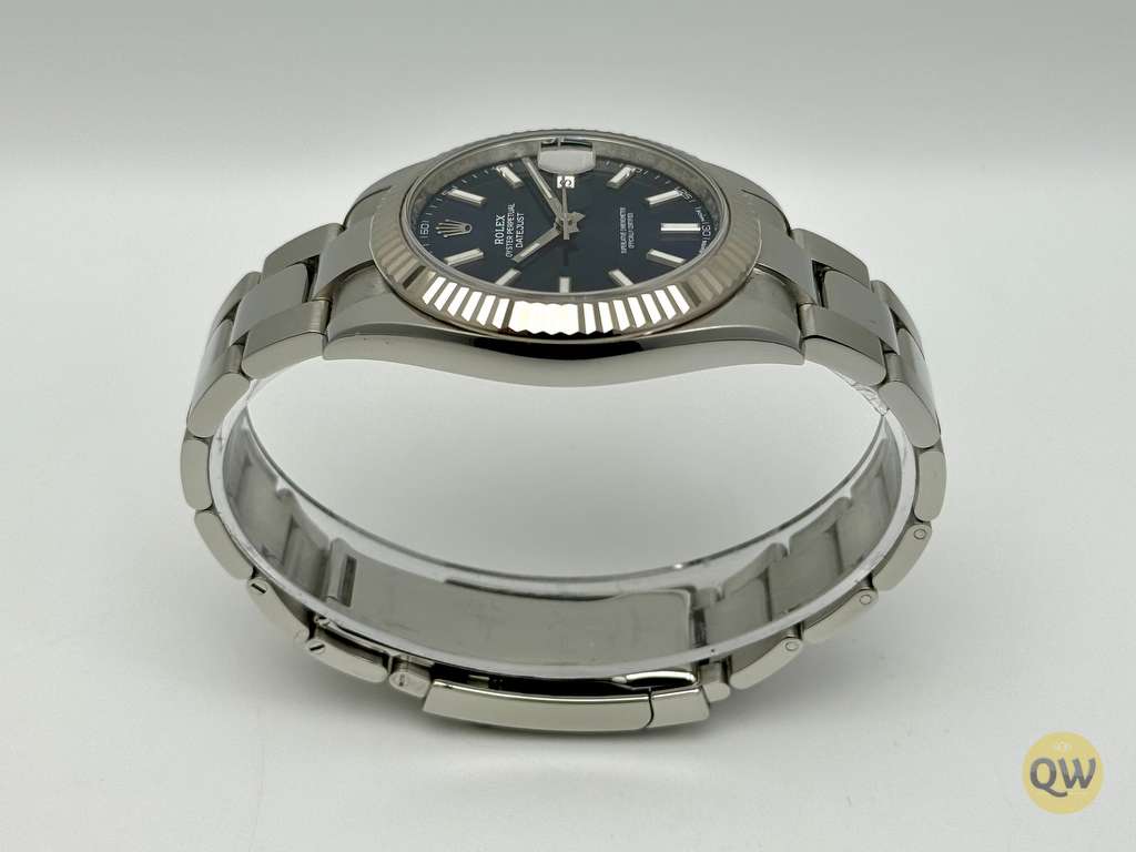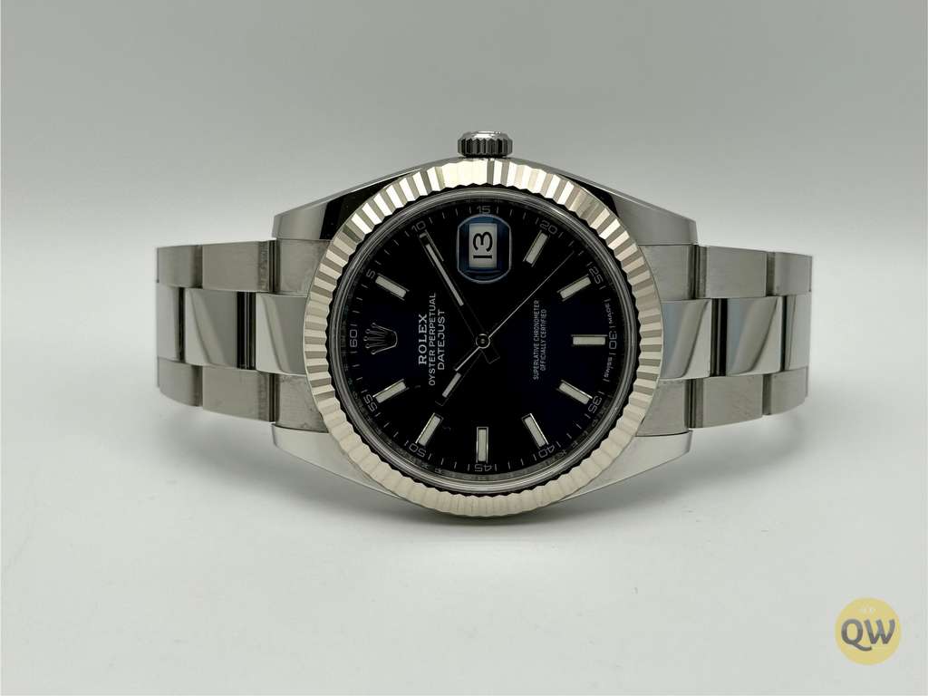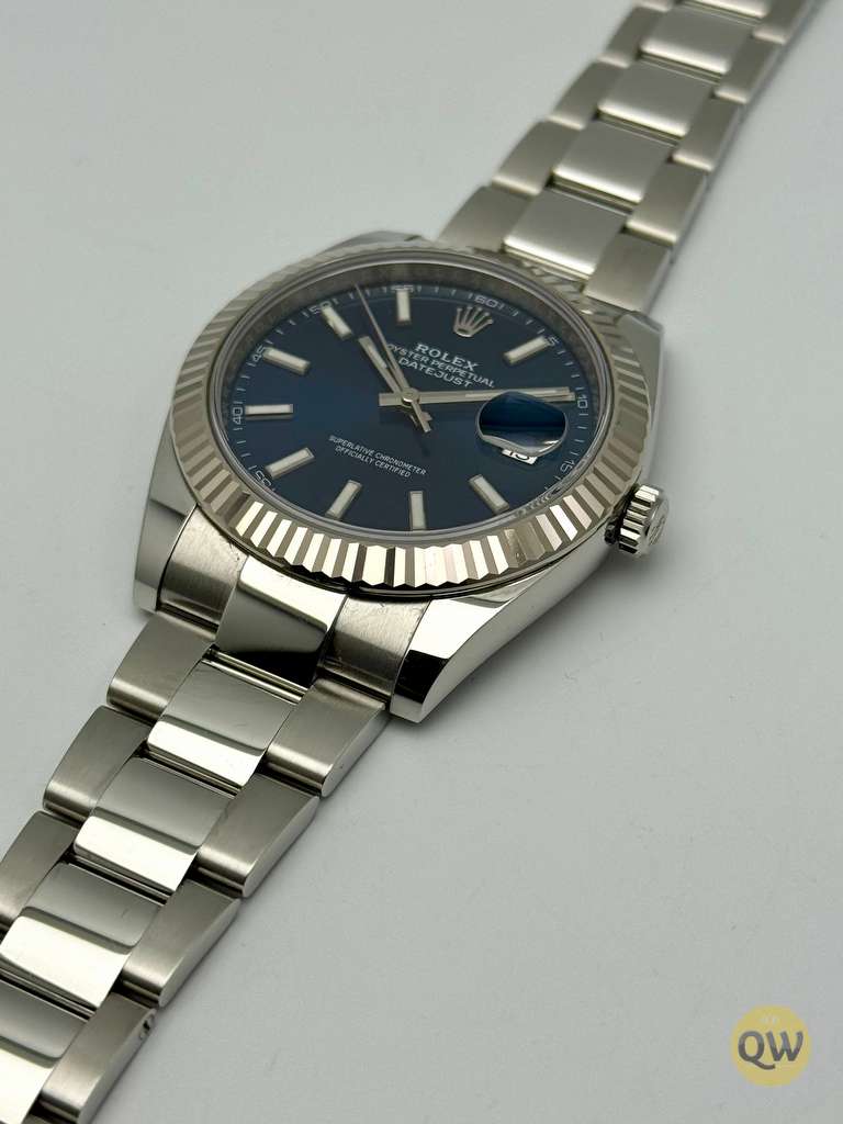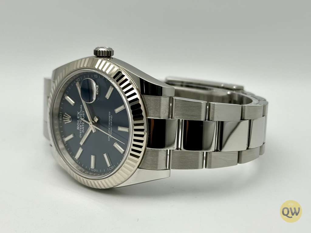 The Rolex Datejust 41 referece 126334 features a 41 mm Oystersteel case paired with an 18k white gold fluted bezel — a hallmark of Rolex craftsmanship. Its elegant blue sunray dial is complemented by luminous baton hour markers and hands, offering perfect legibility and sophistication. Powered by the in-house Rolex caliber 3235 automatic movement, it delivers a 70-hour power reserve, a frequency of 28,800 vph, and is officially certified as a Superlative Chronometer (COSC + Rolex standards)