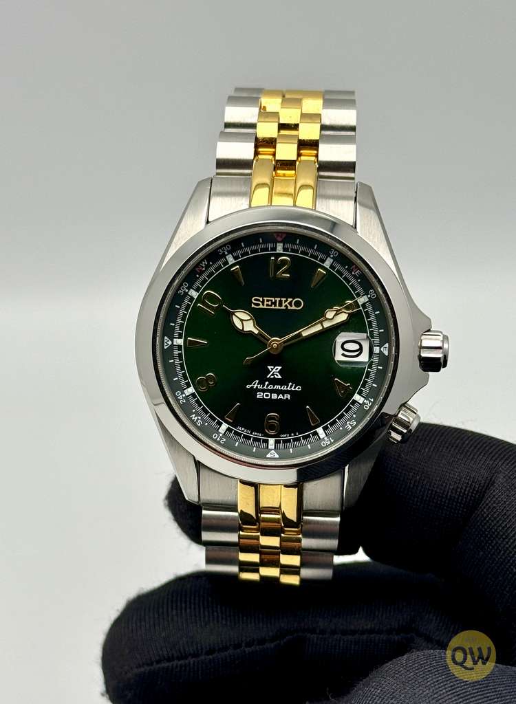 The Seiko Alpinist, reference SPB121J1, is a versatile sport watch combining outdoor functionality with classic design. The watch features a 39.5 mm stainless steel case paired with a green sunburst dial. Applied luminous indexes, cathedral-style hands, and the internal rotating compass bezel give the watch its distinctive character.