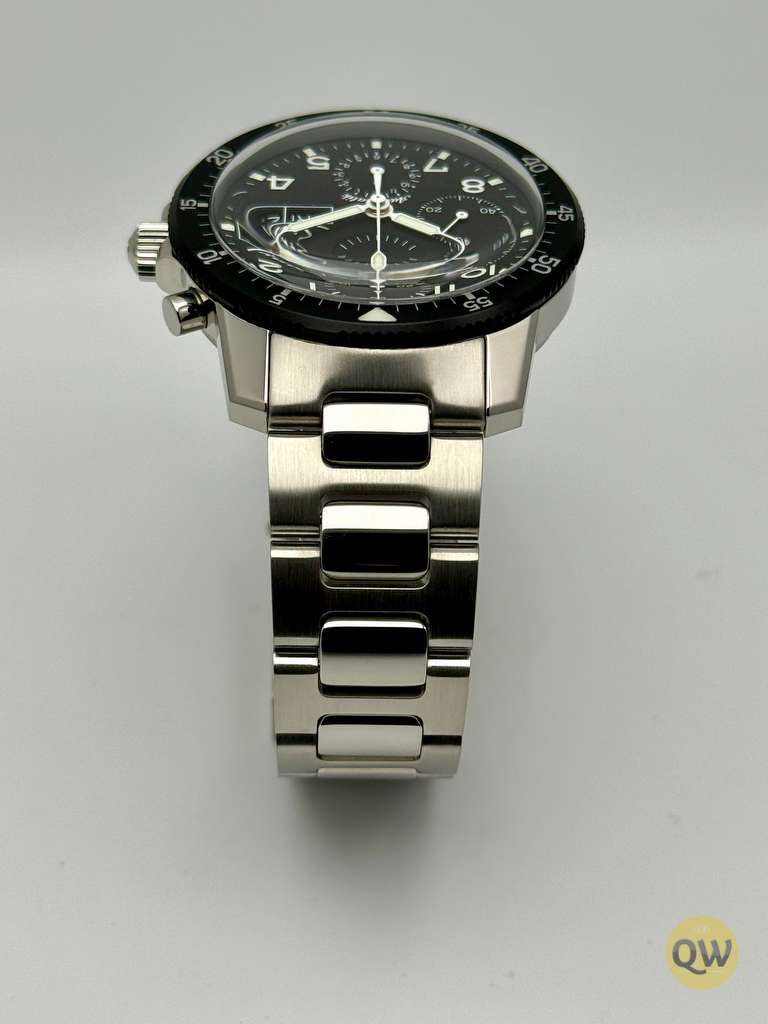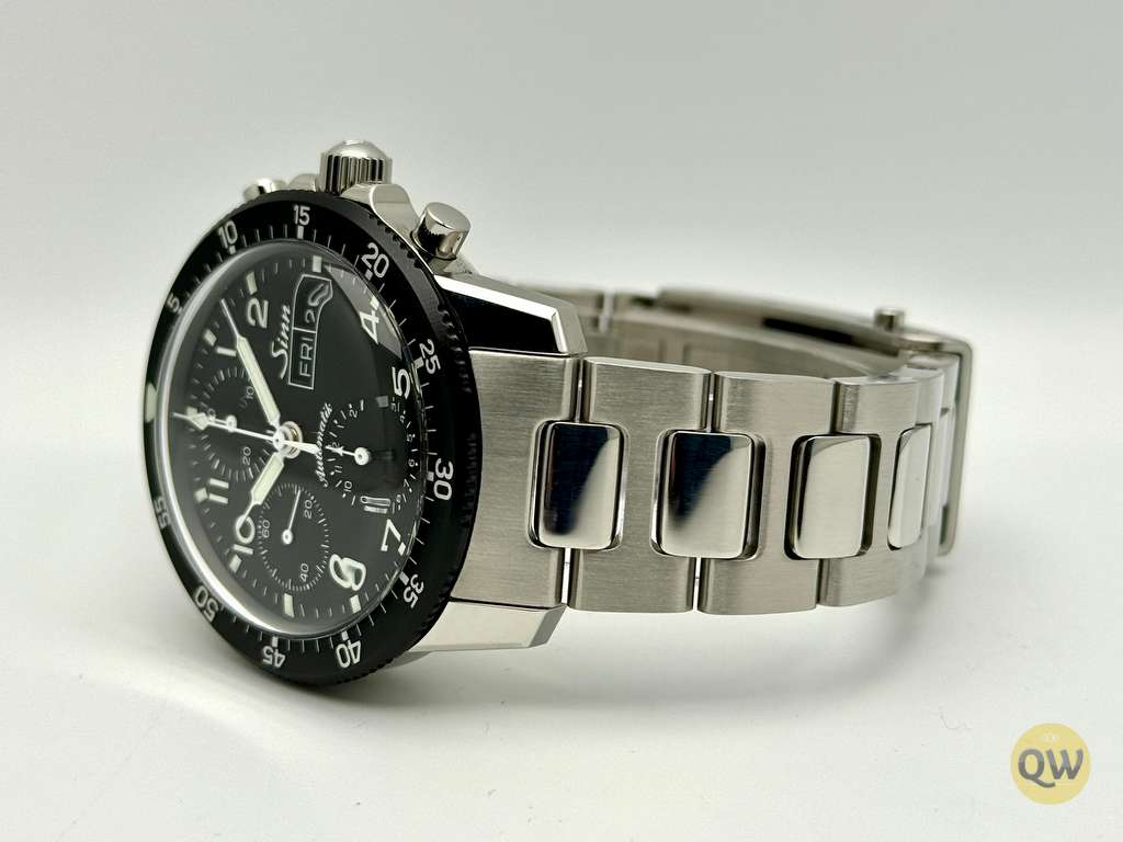 The Sinn 103 ST Chronograph, reference 103.035, features a 41 mm stainless steel case with a matte black dial, white Arabic numerals, and high-contrast chronograph subdials for outstanding legibility. Powered by the automatic Sellita SW510 movement (based on the Valjoux 7750 architecture), it offers a 48-hour power reserve, a frequency of 28,800 vph, and functions including central chronograph seconds, 30-minute and 12-hour counters, small seconds, day-date display at 3 o’clock, and hacking seconds.