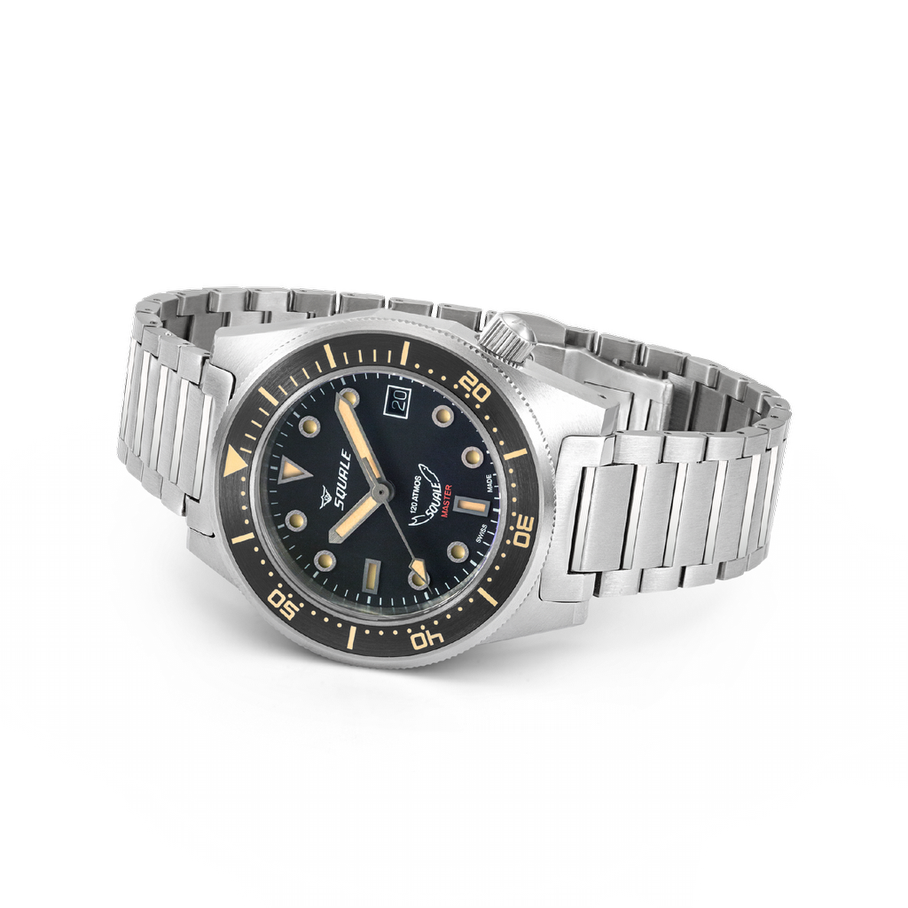 Discover the new Master Titanium 120 ATM, a dive watch that pays homage to Squale's rich history. Designed for underwater adventures, this large, ultra-robust tool watch celebrates Squale's 65th anniversary with style and functionality. Its standout feature is the use of grade 5 titanium for the first time in a Squale watch, combined with the iconic Von Büren case known for its asymmetrical shape, 4 o'clock crown position, and squared profile.