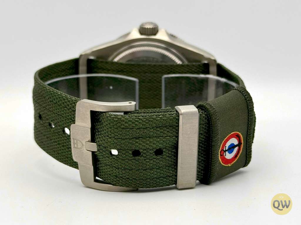 A scratch-resistant sapphire crystal provides clarity and protection, while the bidirectional 24-hour bezel in titanium with a black ceramic insert supports a third time zone reading. With 200 meters of water resistance and a screw-down crown, this watch is built for both aquatic and aerial duty. It is fitted on a single-piece green fabric strap with a titanium pin buckle and an extra fabric keeper bearing the French Naval Aviation roundel.