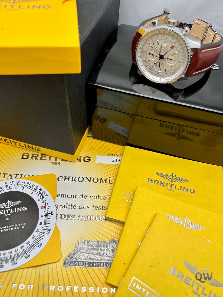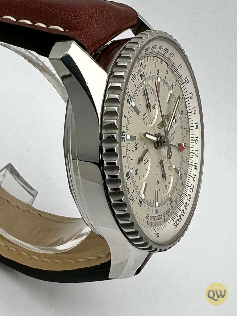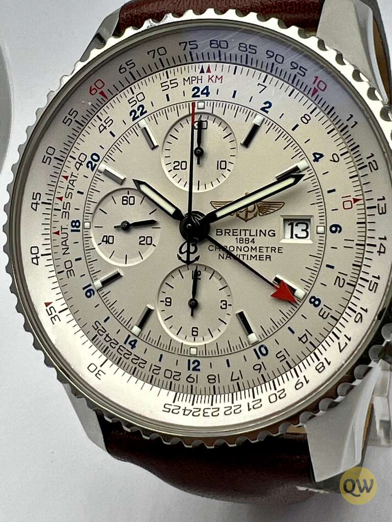 The Navitimer World GMT was designed for pilots and international travelers as a larger version of the standard Navitimer. This Navitimer is from december 2008 with the lovely white dial. It is in very good condition, with some hairlines on the AR coating of the sapphire and with an aging inner box.