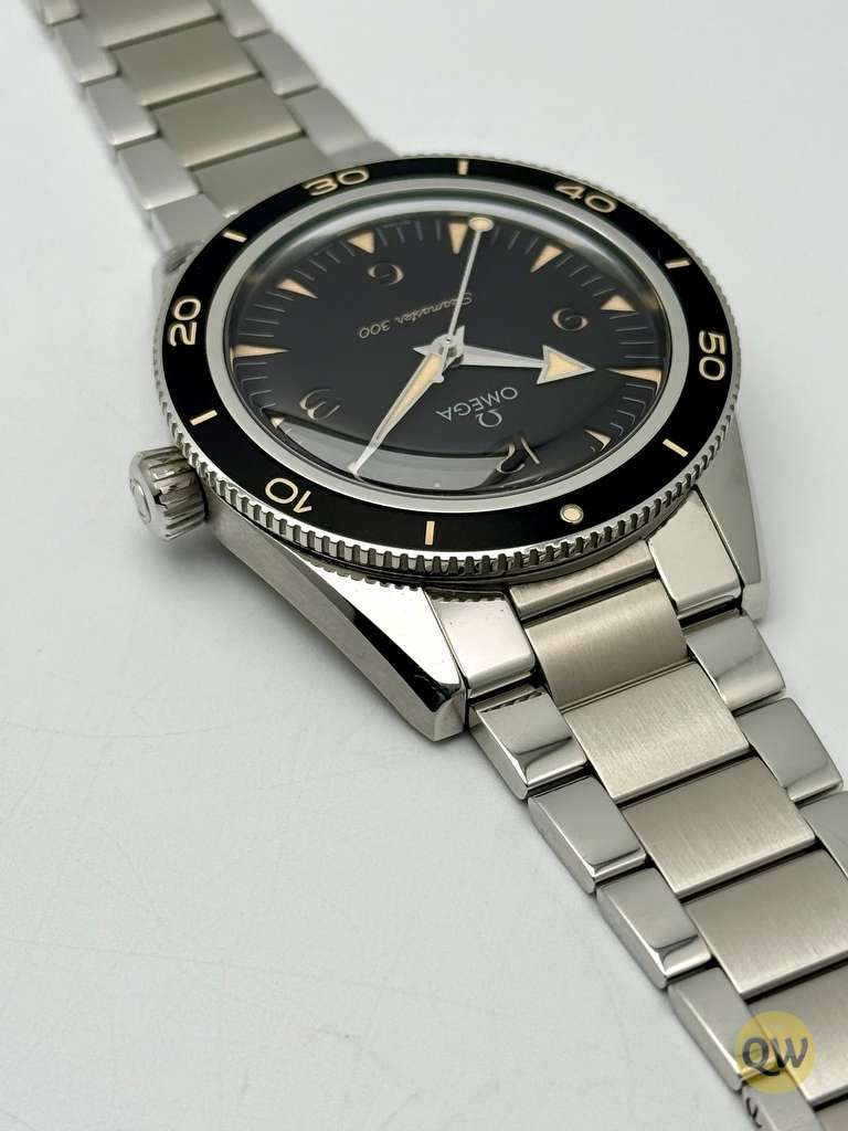 OMEGA first introduced the Seamaster 300 in 1957, specially designed for divers and professionals working underwater. More than 60 years later, the watch has been totally updated with an improved shape that is ready for a new generation of adventurers. This 41mm stainless steel model features a black dial and oxalic acid anodized black aluminum bezel with a dive scale filled with "vintage" Super-LumiNova. The recessed hour markers and profiled numerals contain Super-LumiNova, just like the rhodium-plated hands. With stainless steel bracelet, this watch features a transparent, sapphire crystal caseback, which allows a clear view of the OMEGA Co-Axial Master Chronometer caliber 8912 movement.